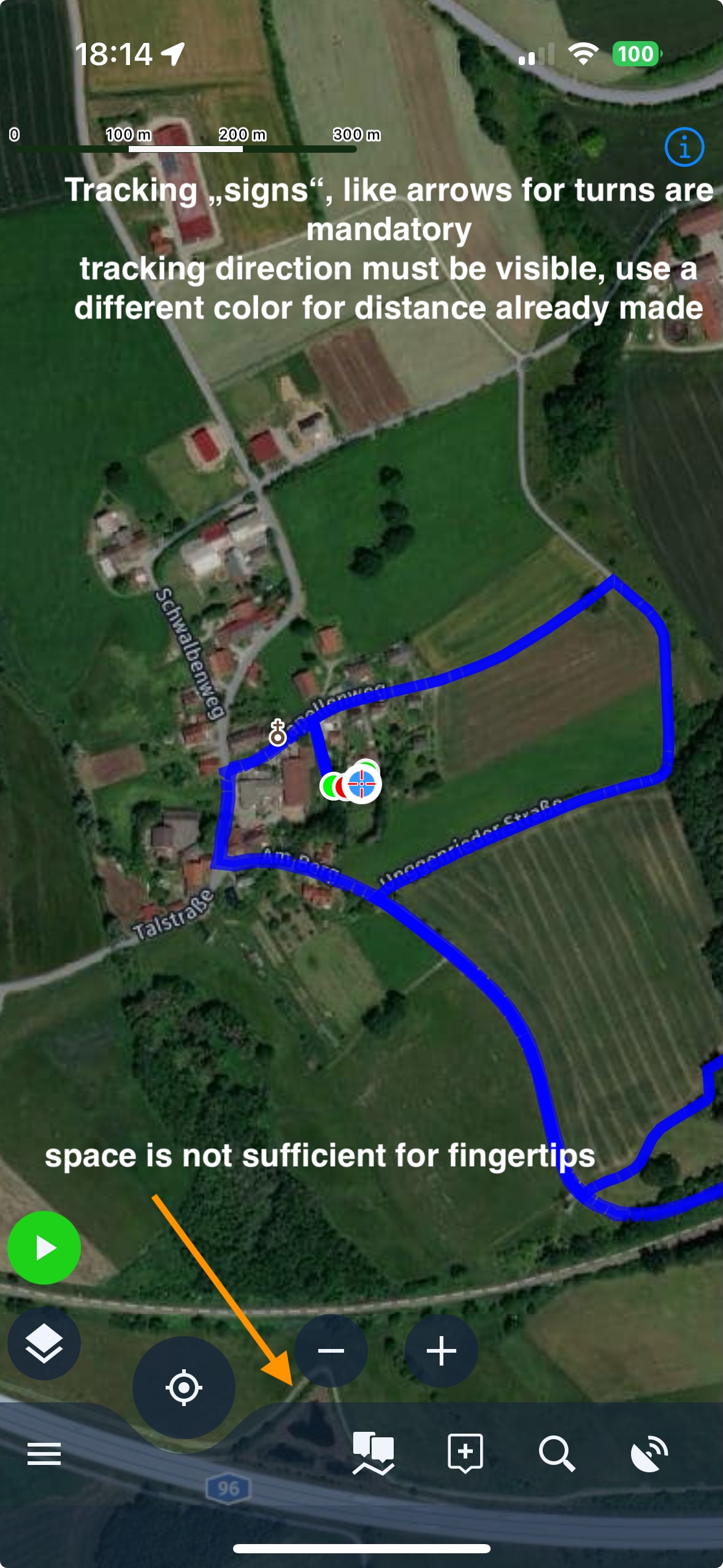 3. while using a web generated and exported GPX track, there's no visible tracking feature available, e.g. small arrows on the track itself to show in the right direction, no different color for the track already made versus the entire track, no direction arrows and no distance "warning" before turns