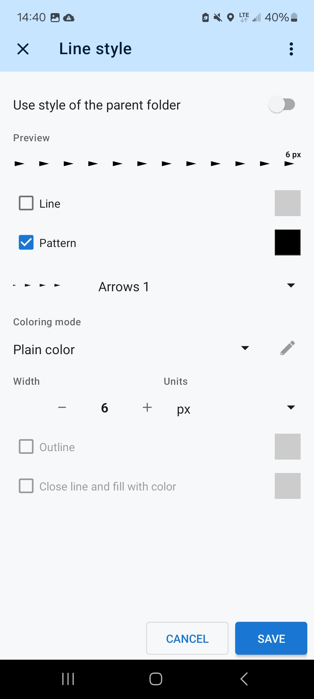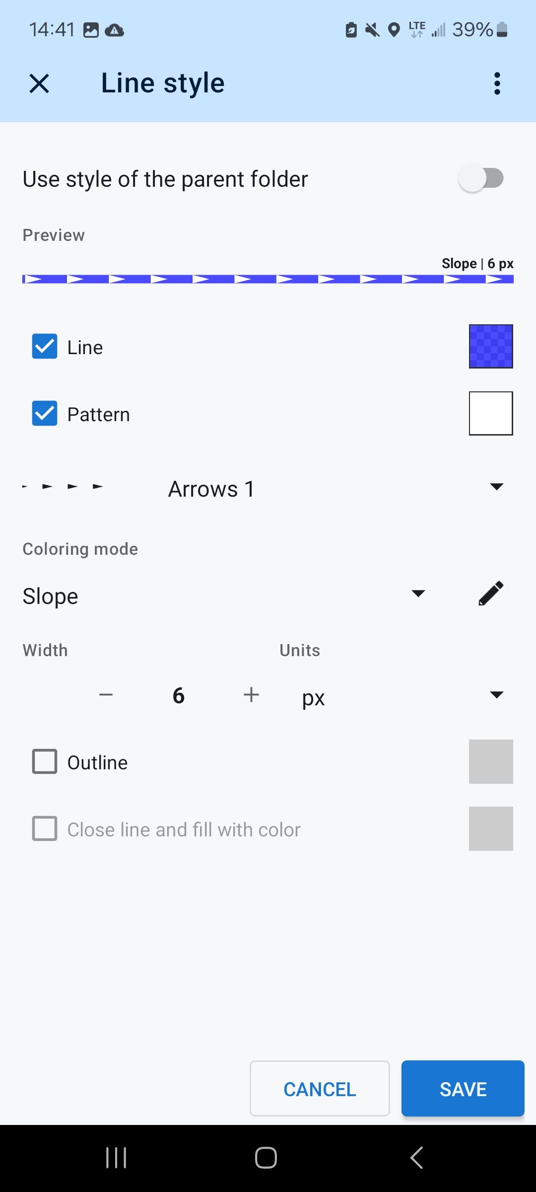 Locus Map's line style editor offers many options. Everyone can choose. This one combines good visibility of the underlaying map and slope gradient coloring of the route direction arrows: