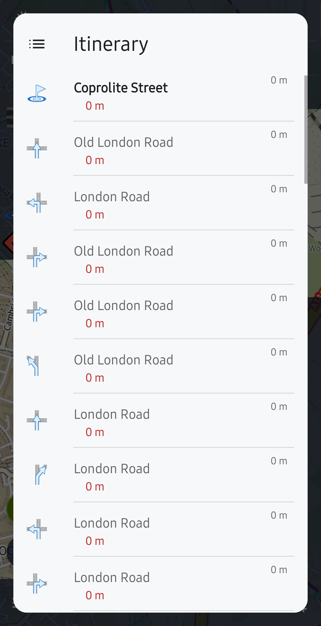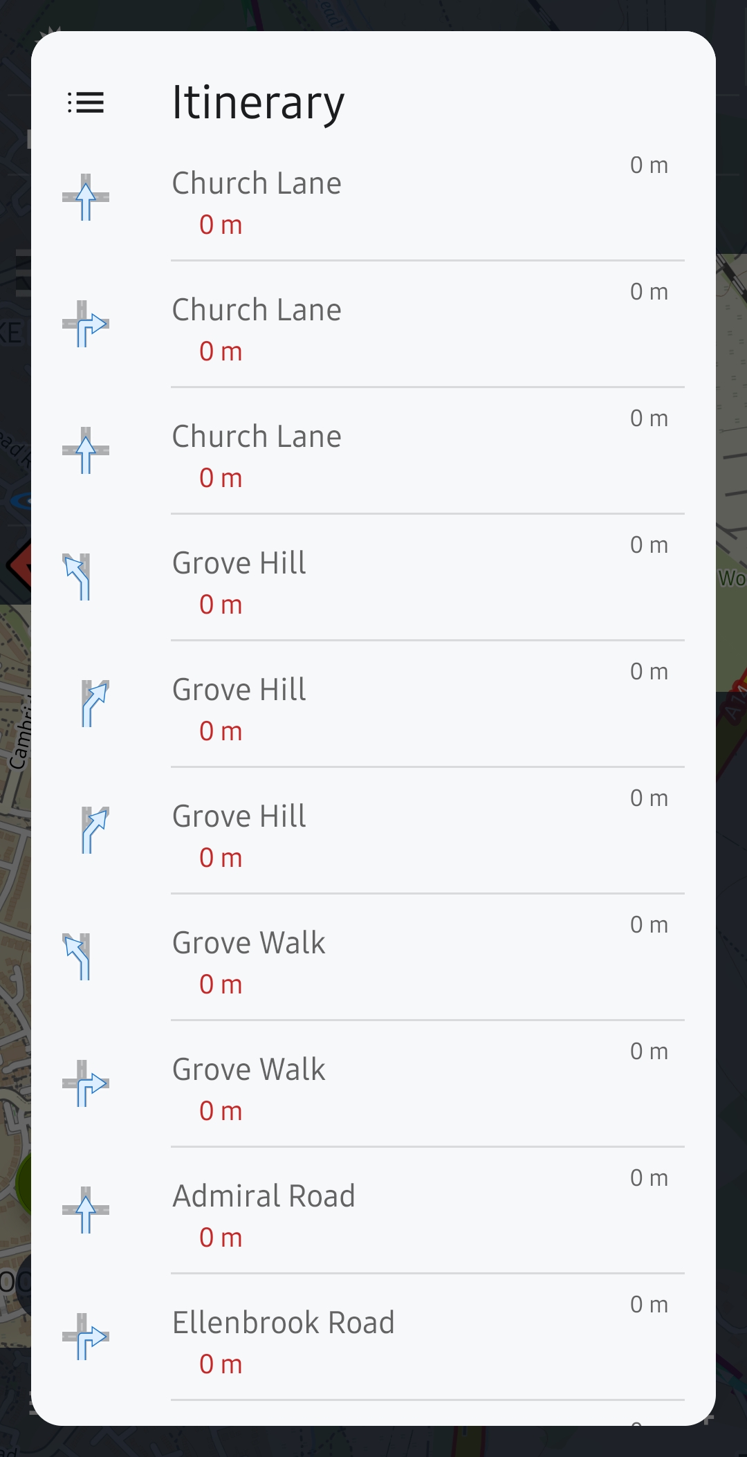 To reproduce this I planned another route from home when I had more time and found that it seems to group all the turn info into the first 0m of the trip. It then has no further turn instructions so shows your next turn as your final destination.