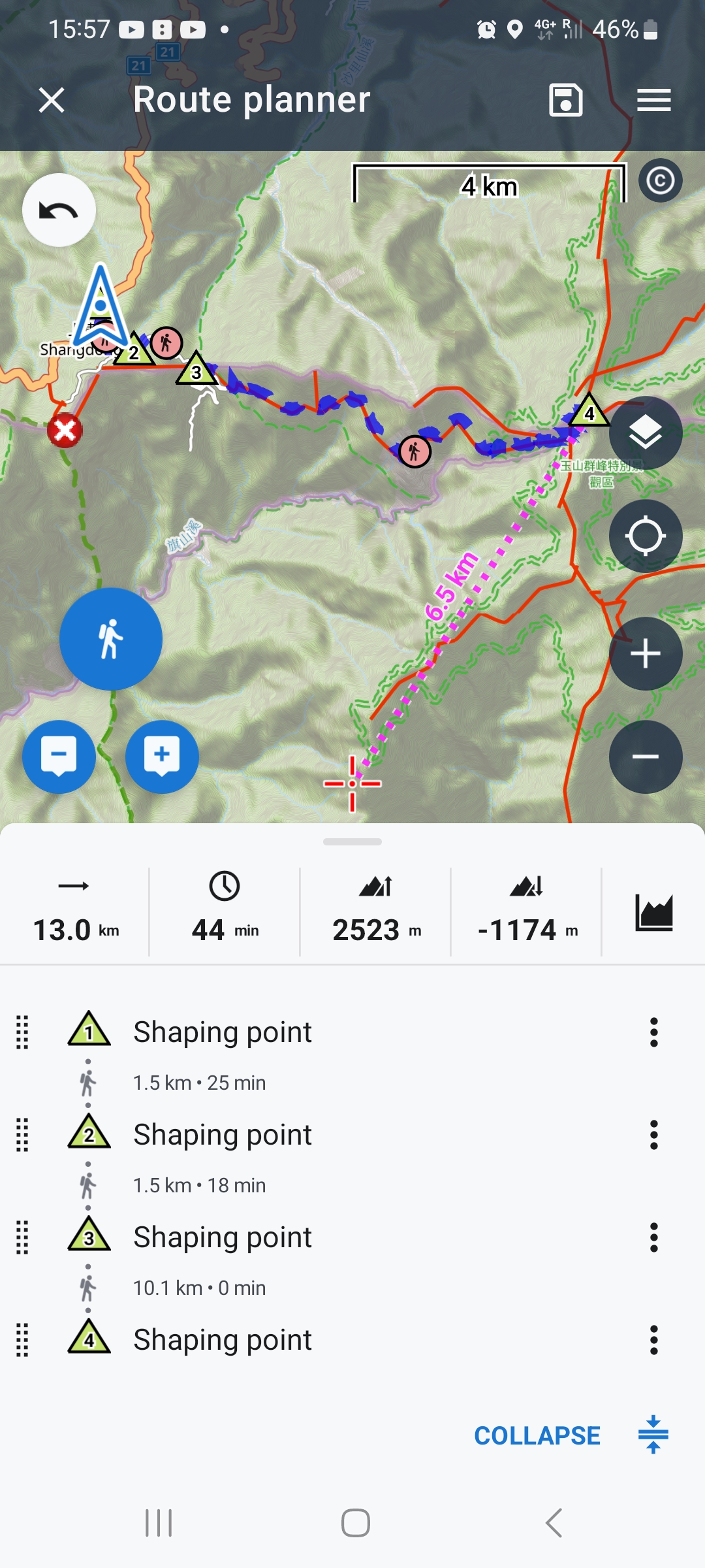 We calculated a route from Dongpu Lodge to Yushan peak in Taiwan and found a substantial difference in elevation gain between the two apps: LocusMaps calculates 2300 m up and 1000 m down; Mapout Calculates 1700 m up and 400 down.