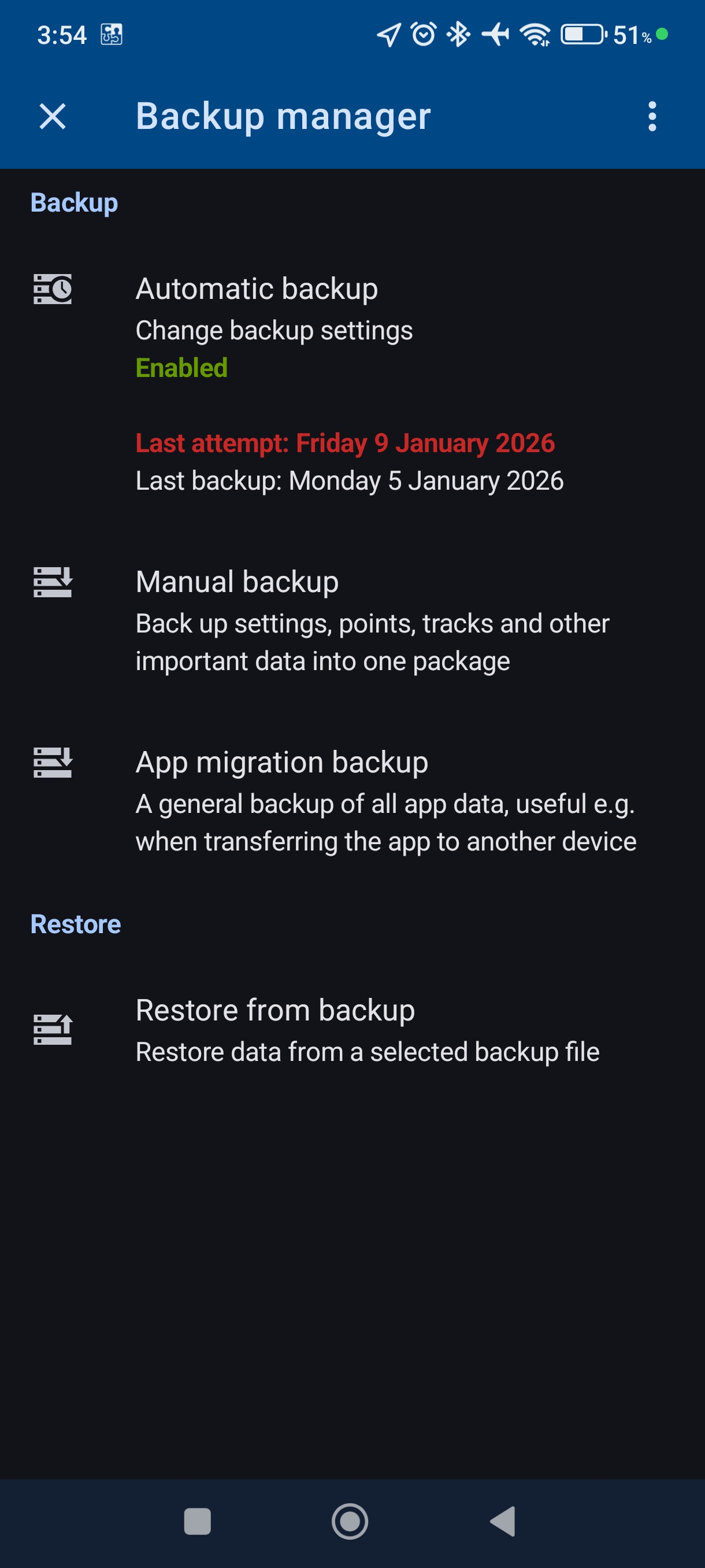 I haven't tried every two days as a nightly backup to include that days tracking (and added/changed planned points) is what I want. I select to back up everything as that is simpler and allows me the option to restore everything onto my tablet. I could no doubt reduce this, accepting that the backup process is useless, but I prefer to avoid doing that. I could mirror the export folder for recorded tracks (as I export to GPX and KML after stopping recording) using DriveSync but again that is working round bad software.