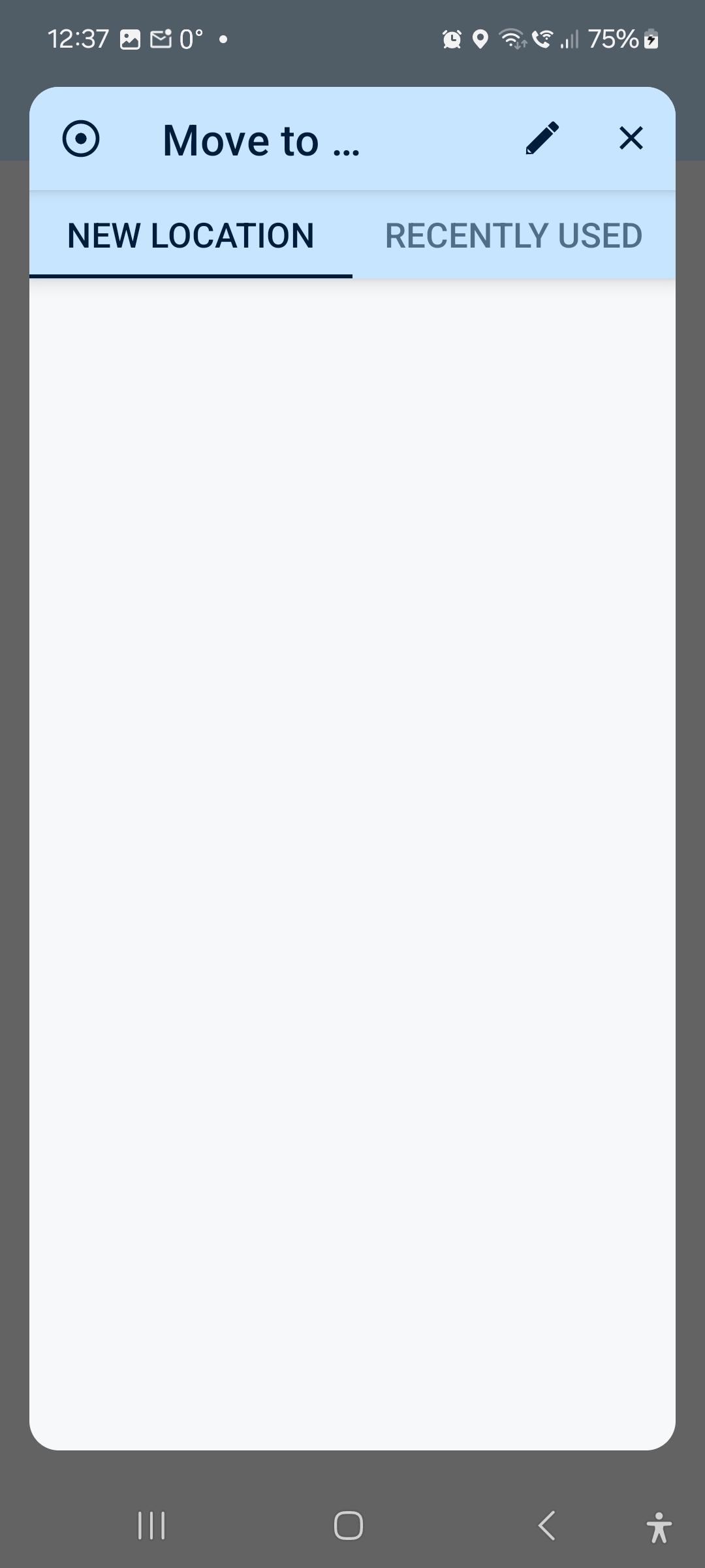 When I tap the search symbol, I end up in a full screen dialog with title "Move to ..." Right of it is a pencil und a close button. There is no input field at all. Is this really the way,