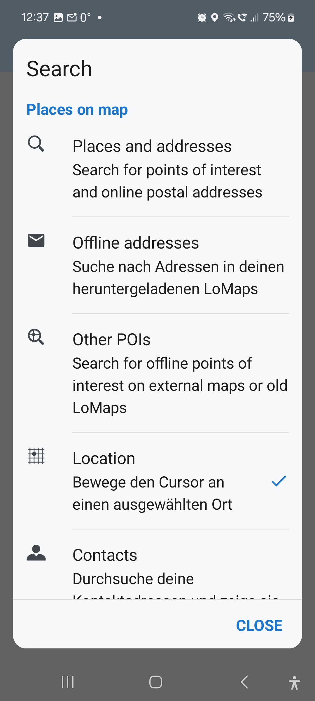 Locus Map offers the last used search method when you tap the search button later. We recommend to keep all location sources available:
