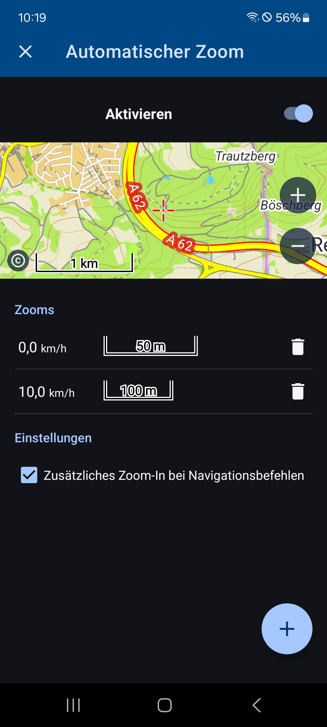 The automatic zoom in conjunction with “Additional zoom-in for navigation instructions” does not work as expected. I expected the specified zoom level to be displayed depending on the current speed and the zoom level to be temporarily increased before a turn-off instruction.
