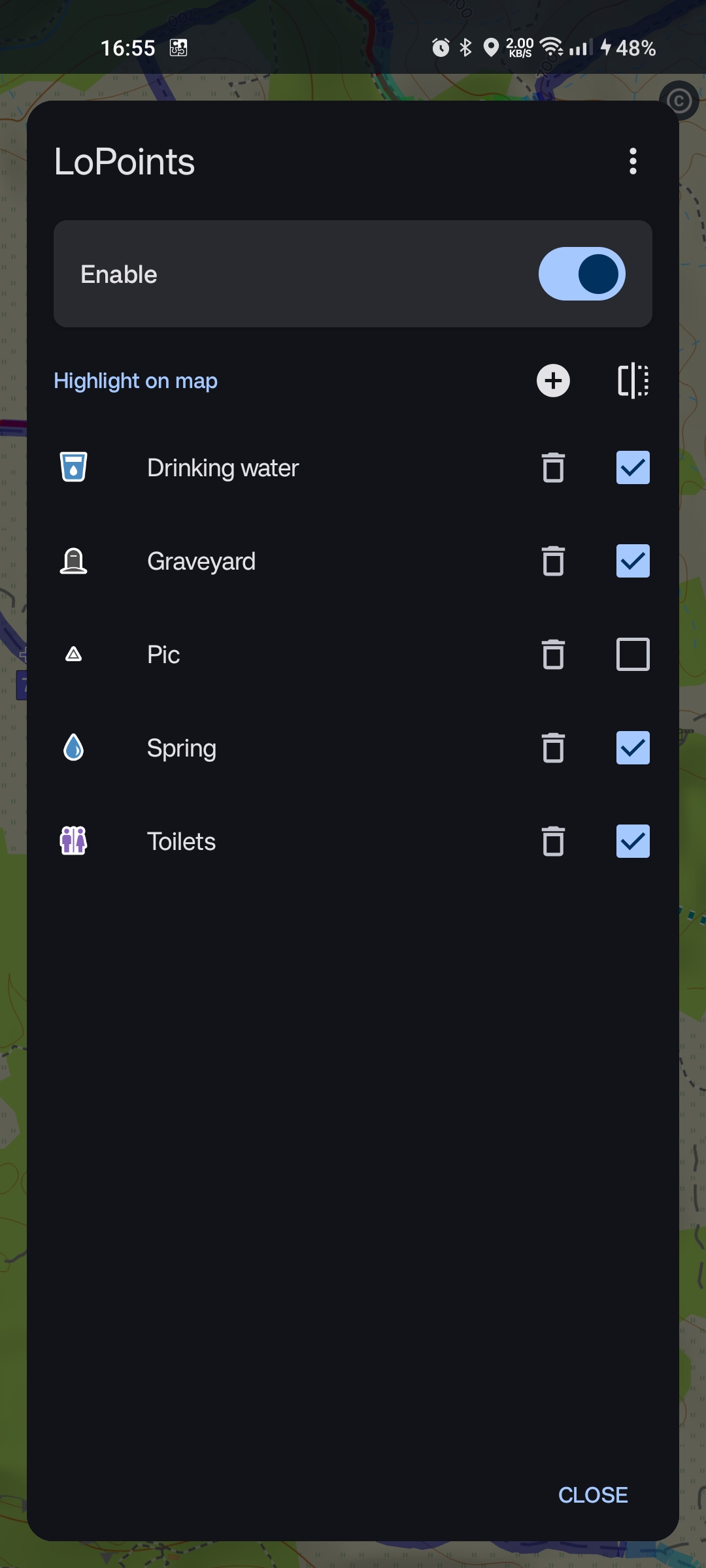 I use the POIs: Drinking water, Graveyard, Spring, Toilets.