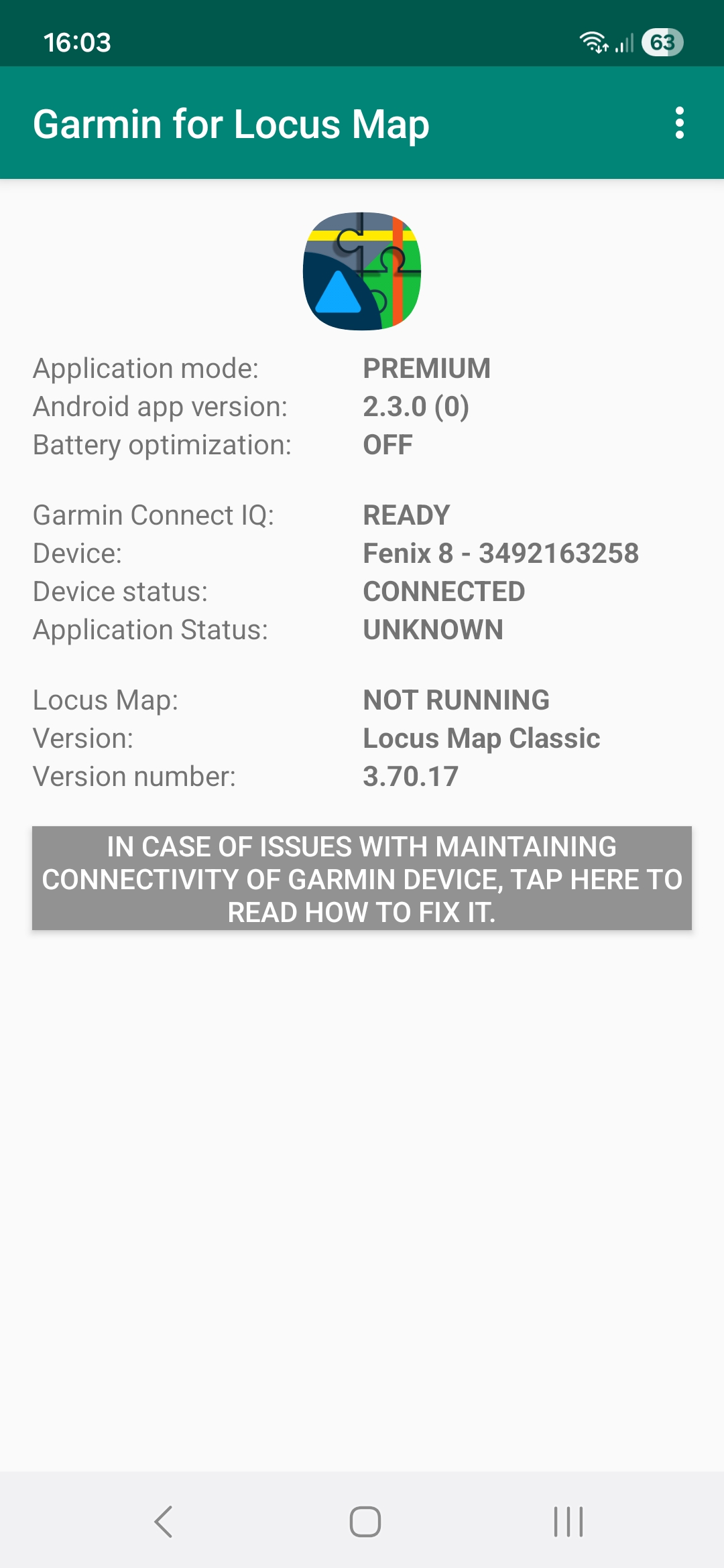 A funguje vám aplikace Locus Map v hodinkách, když ji normálně spustíte zde? Rád bych ověřil, že "Garmin for Locus Map" v telefonu v tomto případě běží jak má a poskytuje aplikaci v hodinkách data.