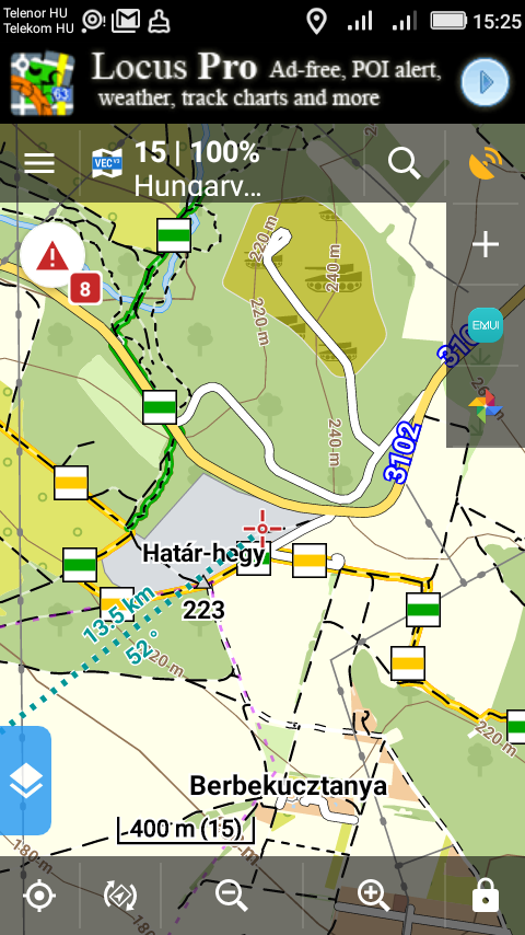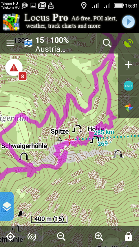 Csatolom a fotókat. Láthatod, hogy Magyarországon ott vannak a túrautvonalak. Ausztriában viszont a bejárt túrautvonalon csak a locus lila nyomvonalrögz ítése van és nem mutat túrautvonalat, pedig kellene lennie piros fehér túrajelzésnek.