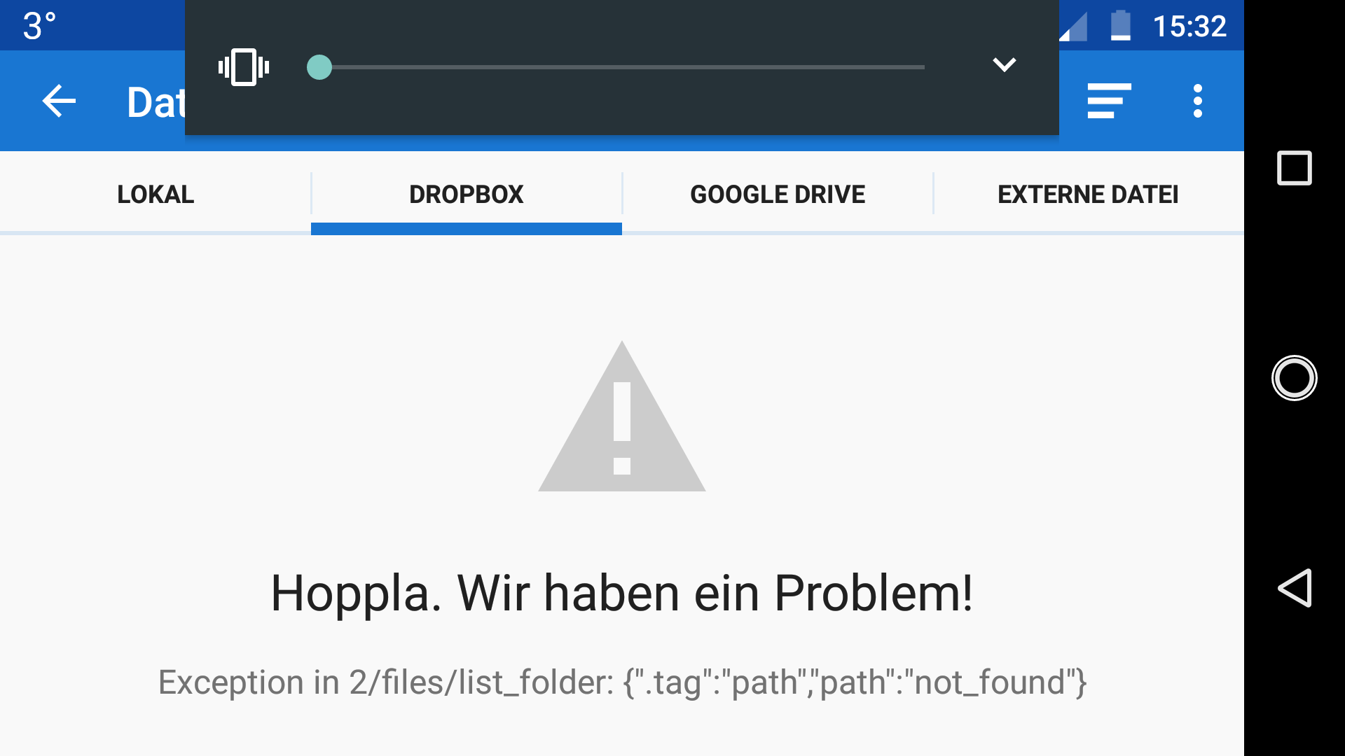 Before it worked trouble-free. Now, if I try it, I get the errror message: We have a problem! Exception in 2/files/list_folder: {".tag":"path","path":"not_found"}Direct access to Dropbox on my smartphone and my laptop works trouble-free.