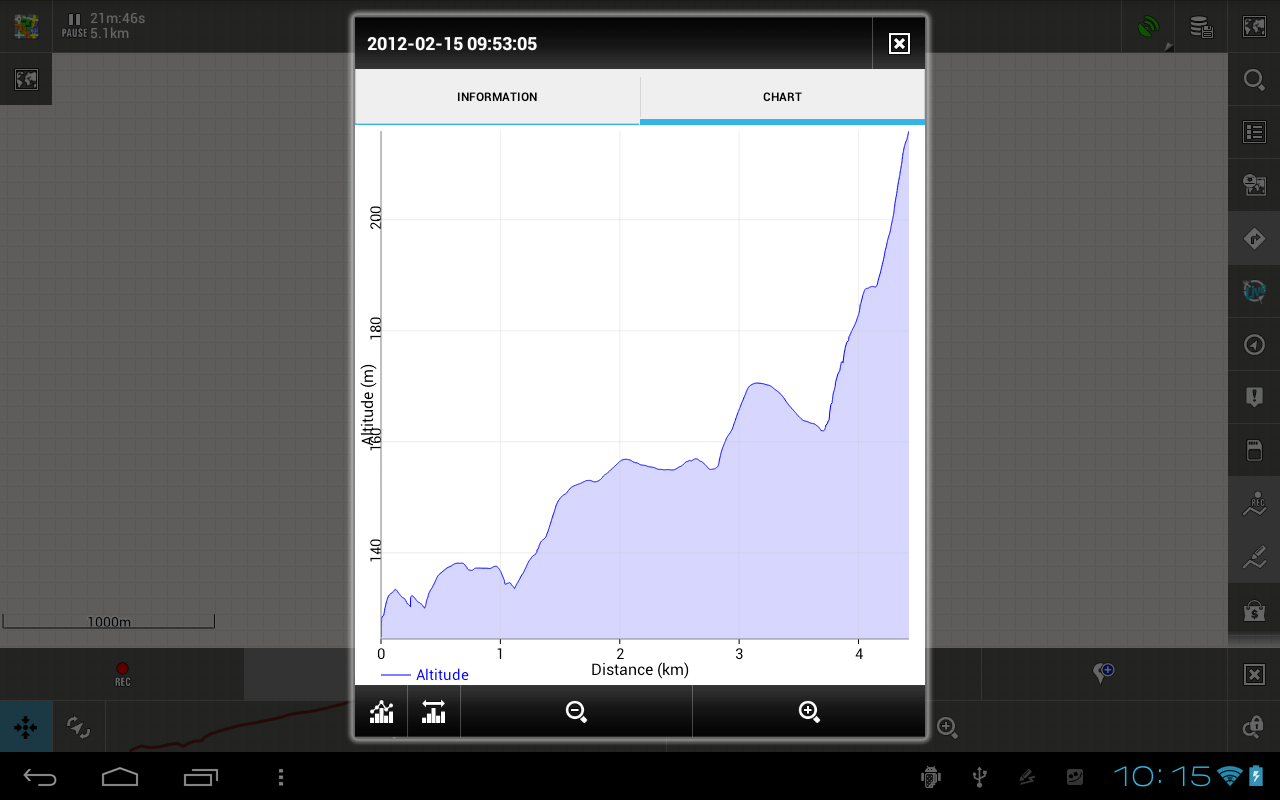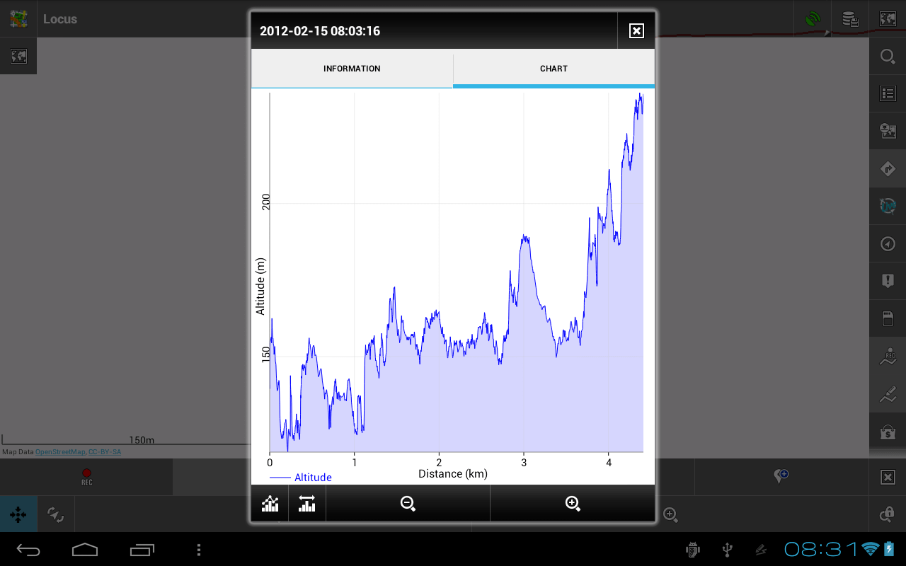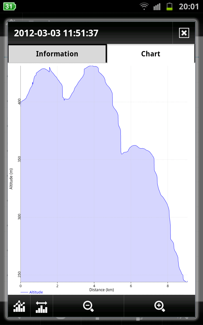 Another interesting observation: as you can see from the chart above, total distance = 6.7km about. However, the "Information" tab of the same track says Length = 7.9km. Also I have the saved point "Point 1", which was saved when the recording said distance = 4km. On the chart above it is at distance 3.2km or so.