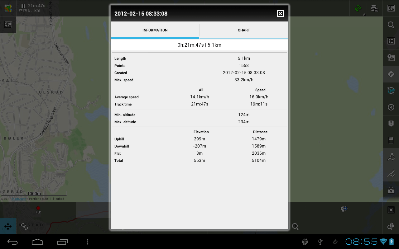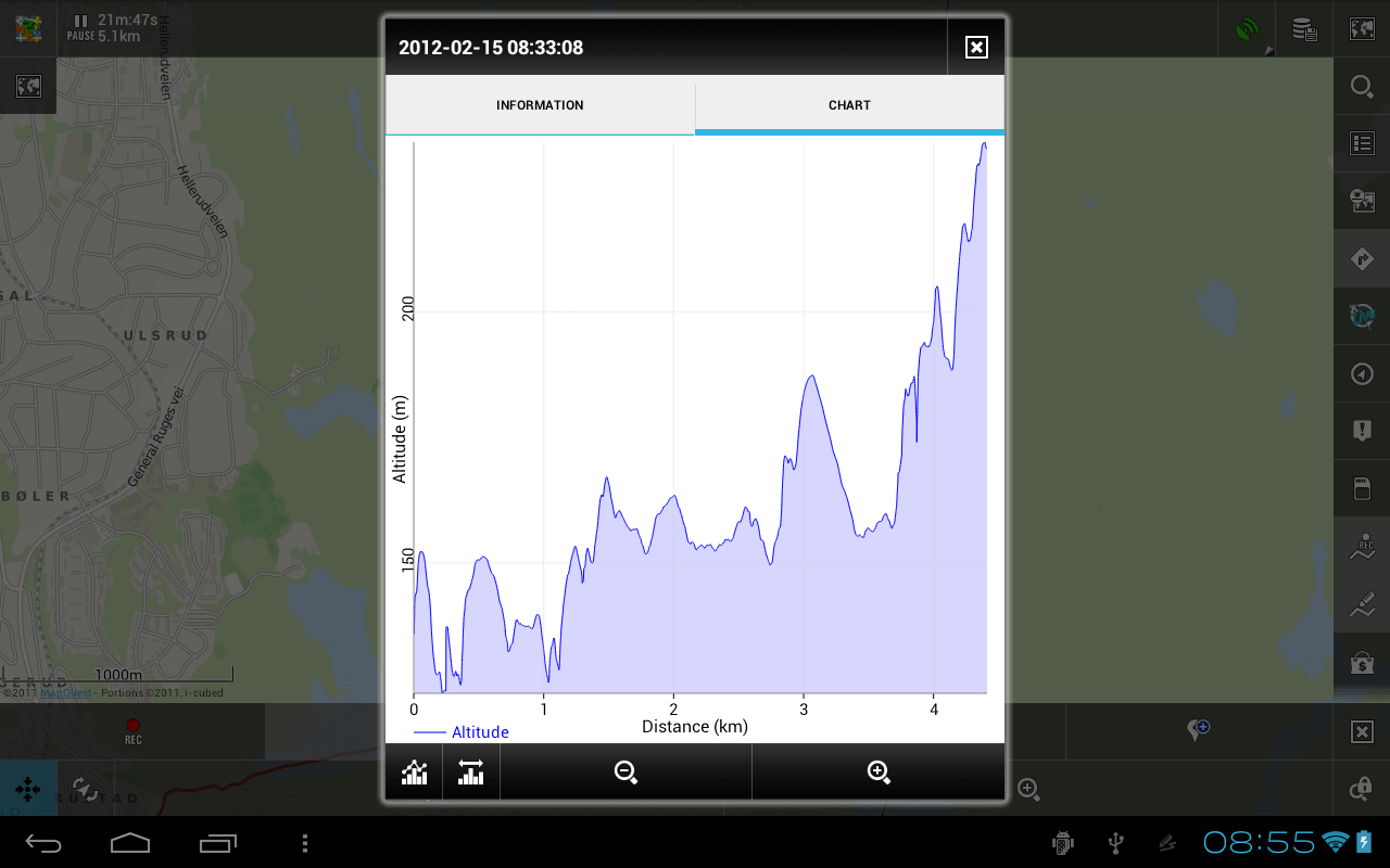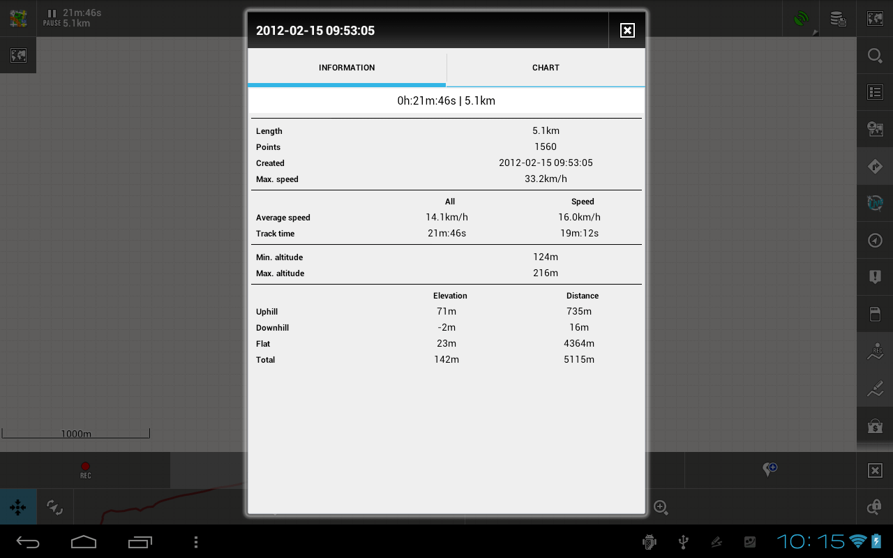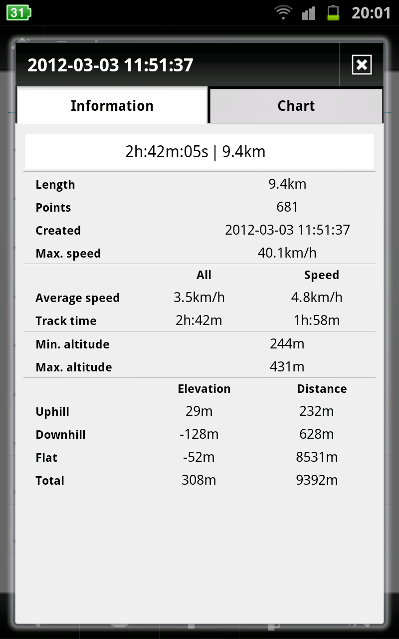 Another interesting observation: as you can see from the chart above, total distance = 6.7km about. However, the "Information" tab of the same track says Length = 7.9km. Also I have the saved point "Point 1", which was saved when the recording said distance = 4km. On the chart above it is at distance 3.2km or so.