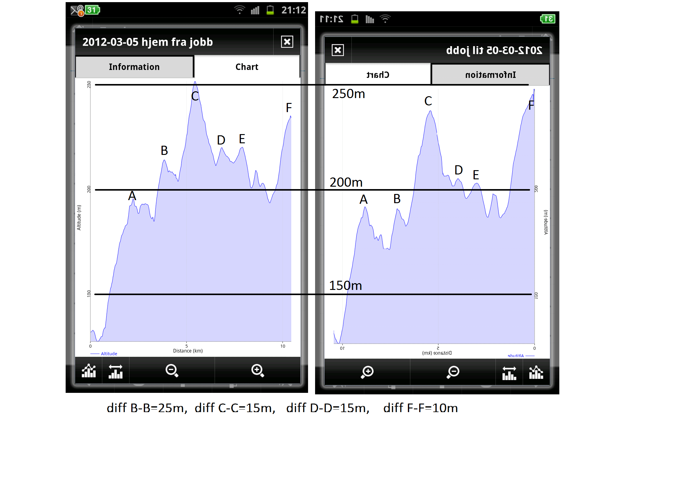 Here are the two graphs put together. One is the track to work in the morning, the other one is home from work the exactly same path. For easy comparison I have mirrored one of them. Also I had to slight adjust one of them to match the vertical scale. Largest difference is 25m.This is very good, I think. Do you agree?