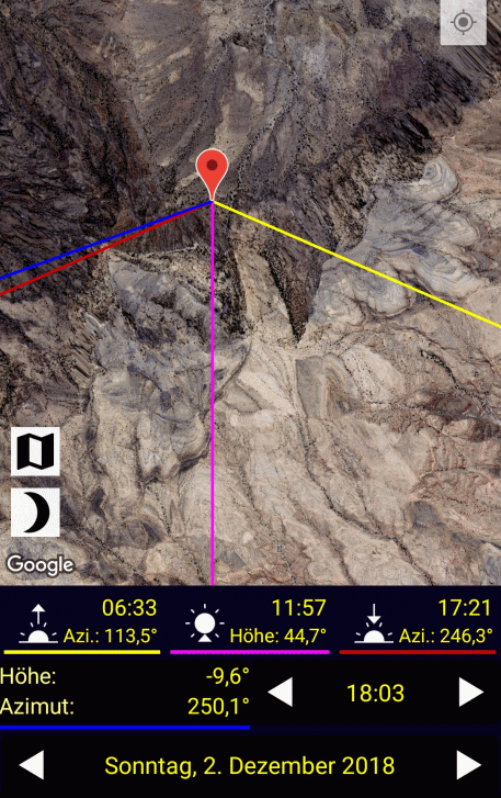 Much more advanced would be a switchable feature, that adds arrows to the main cursor, that point in the direction of the actual sun and sunset/sunrise (known from “LunaSolCal” and other apps). And this for any cursor position, not only GPS.