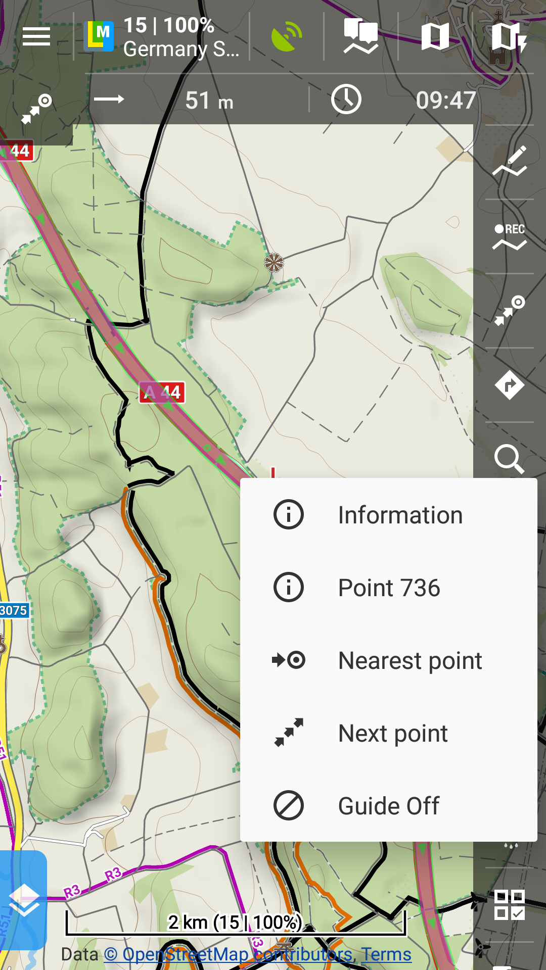 If I quit the Guide it is shown as popup menu for each point I tap, but not when I have it as Guide. There in the context menu I only find (for me useless) info about Point number or Next point. The Information in this menu neither contains the information about distance to target.