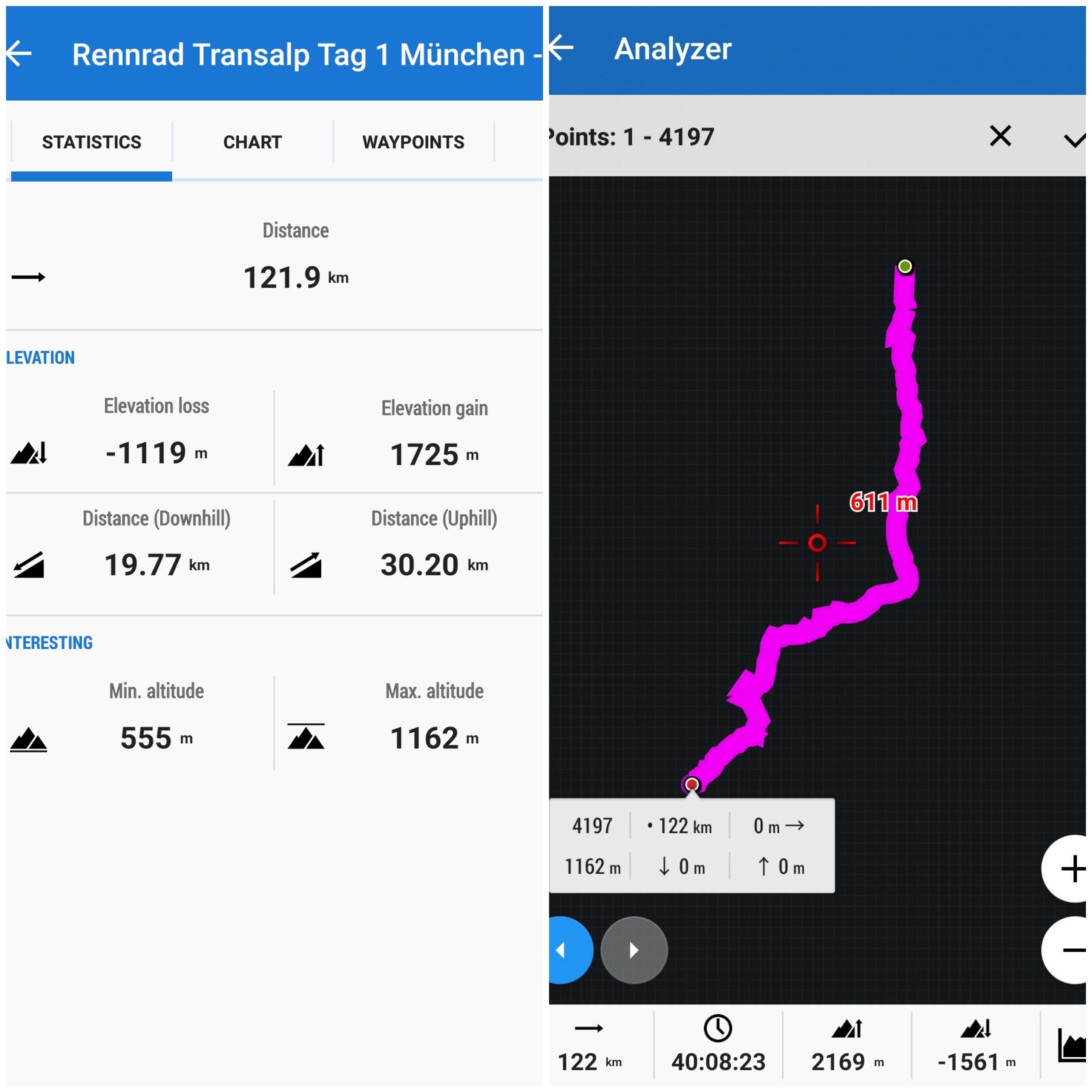 altitude difference 9519 m (up) (stat) vs 12236 m (up) (analyzer). This resulted in 200-400 m difference for daily stages which is a lot.