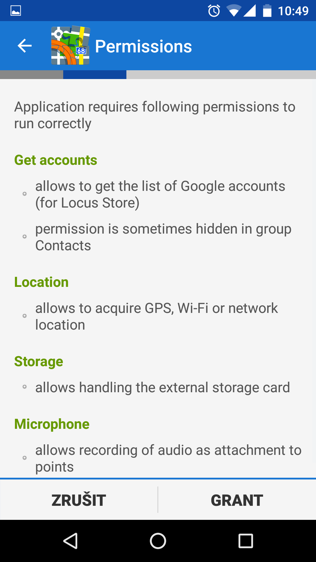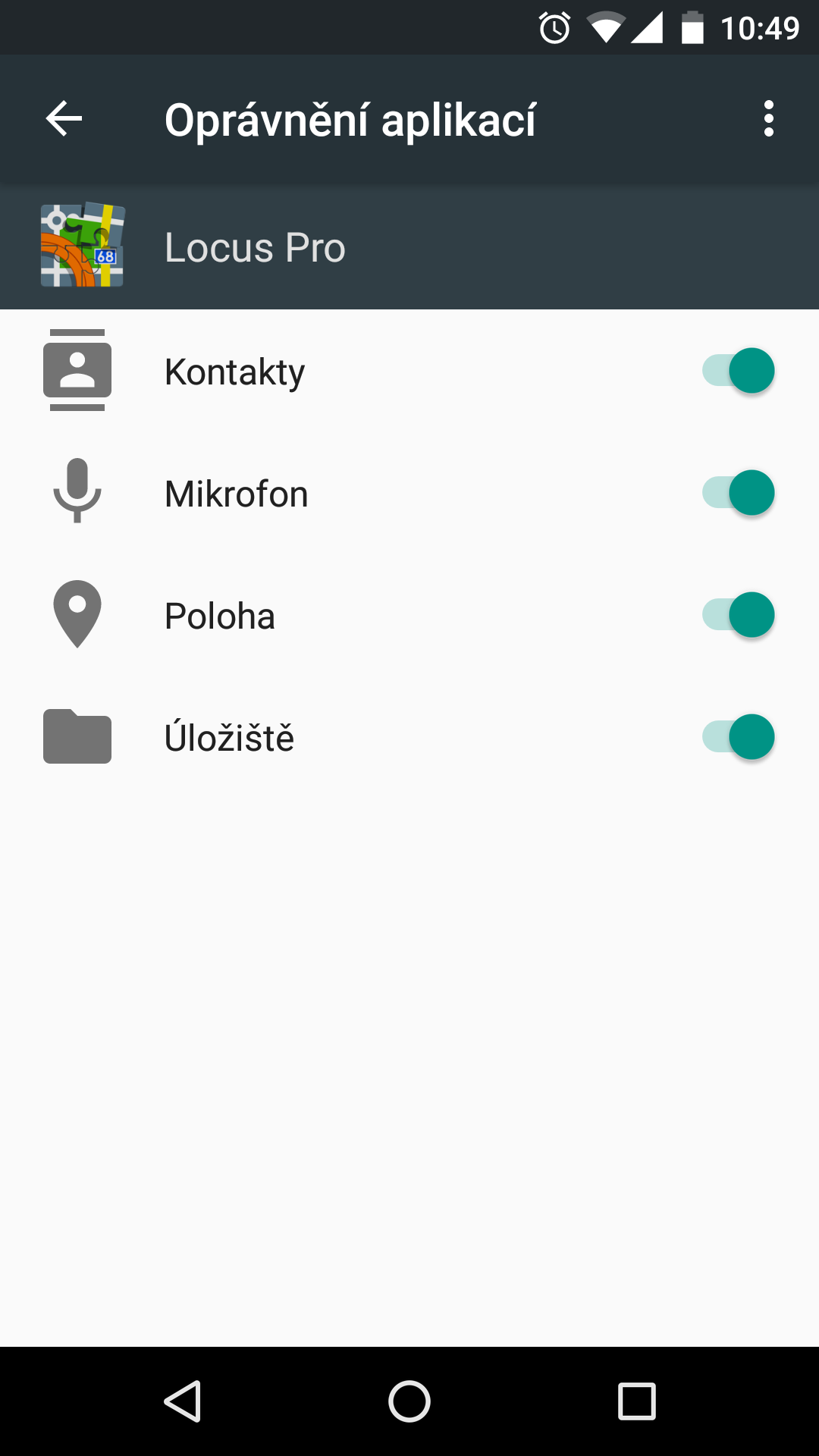 myslím že jediný možný problém je v odmítnutí některého z potřebných oprávnění. Zkuste v telefoním seznamu aplikací najít Locus, kliknout na něj a měla by tam být sekce kde se nastavují oprávnění. Tak prosím zkontrolujte zda máte všechny čtyři u Locusu povolené. Mělo by to pomoci.