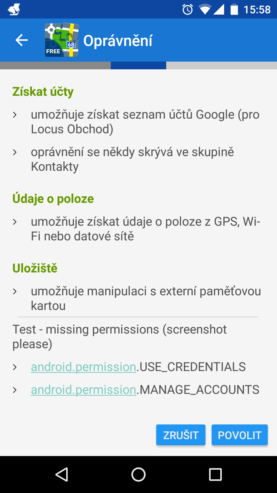 Teda to je divný. Tyhle dvě oprávnění navíc zjišťuju že byly z poslední verze Androida 6 komplet odstraněny. I vzhledem k tomu, že Android 6 už používá celkem dost uživatelů a takový problém ještě nenastal, trošku polemizuju že jsme svědky ještě nějakého nedodělku ve vaší verzi Androidu. Mě na Nexusu 7 2013 běží OTA získaná verze Androidu 6 a tam se tyto dvě oprávnění zpracují korektně. Můžete tedy zkusit jestli nemáte dostupnou novější, ideálně ne nějakou "Developer BETA" verzi pro vaše zařízení a zkusit tuto verzi Locusu na ní? Měla by tam fungovat i aktuální veřejná verze Locusu.
