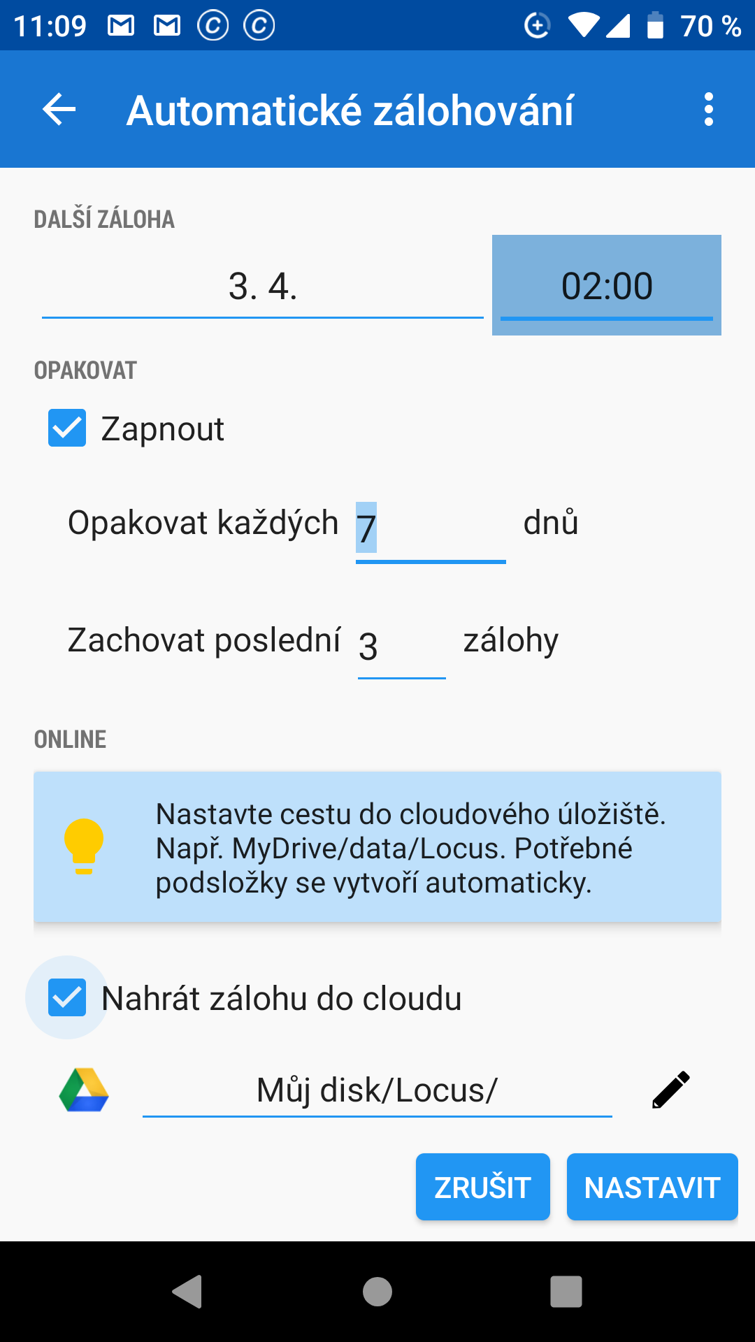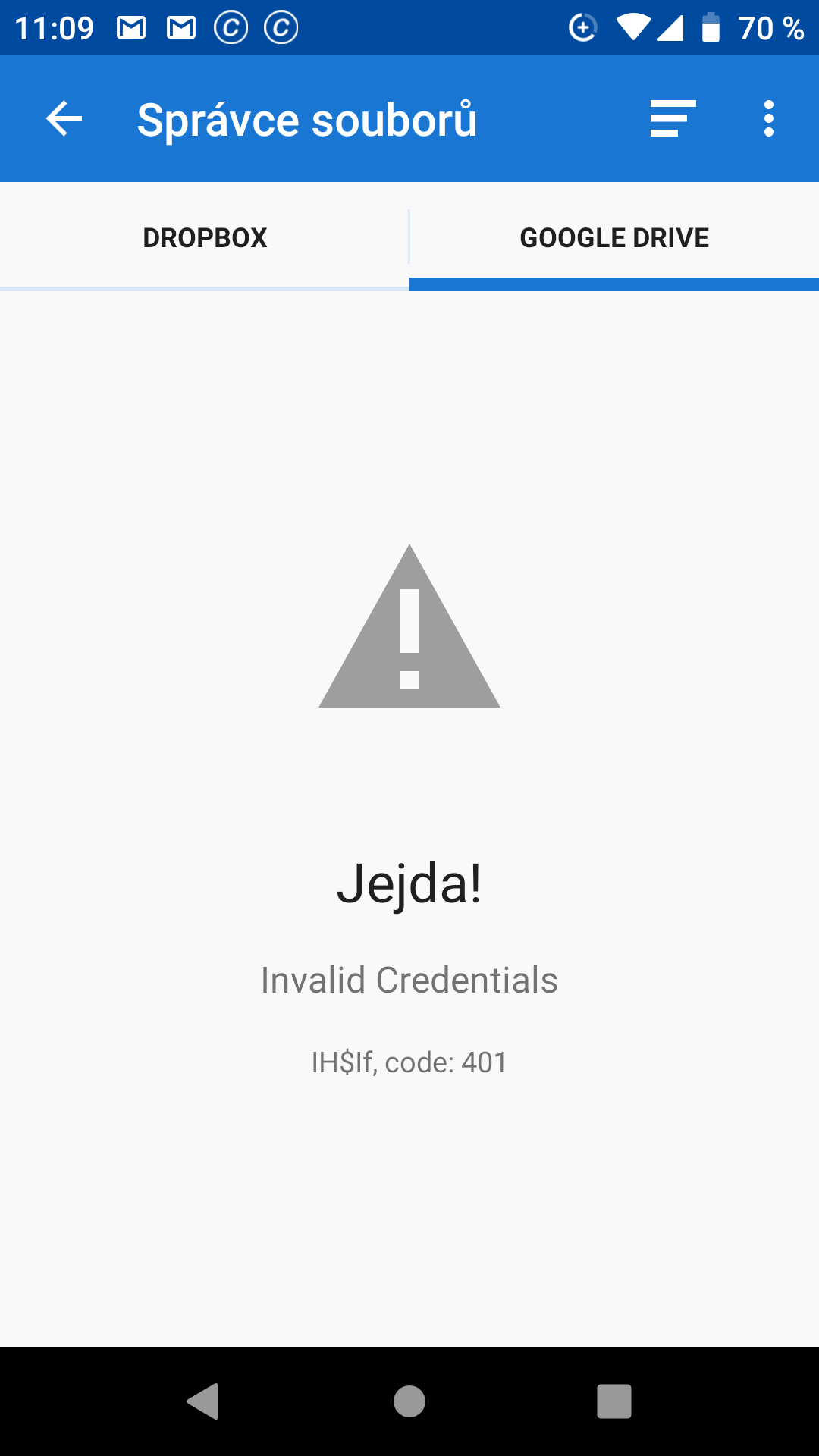 v nastavení zálohování klepněte na tužtičku - pokud je vše OK, mělo by to otevřít složku Locus na Google Drivu. Pokud ne, mělo by to otevřít obrazovku s upozorněním, že nejste přihlášen do Google Drive. Vyhodí to ale tu další možnost, tedy chybové hlášení o "invalid credentials"? Jděte do menu v horní liště toho "Správce souborů a zvolte "odhlásit". Pak se do Google Drive přihlaste znovu. Snad to pomůže.