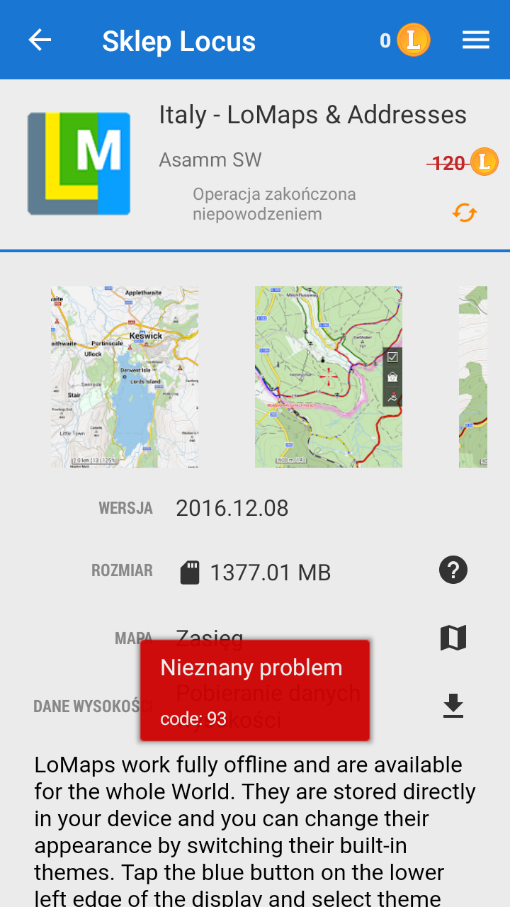 Zakupiłam Locus Map Pro i próbowałam pobrać mapę Italy - LoMaps ver. 08.12.2016 - otrzymuję wtedy komunikat, że wystąpił Nieznany problem code 93 - zrzut ekranu w załączeniu. Proszę o pomoc.