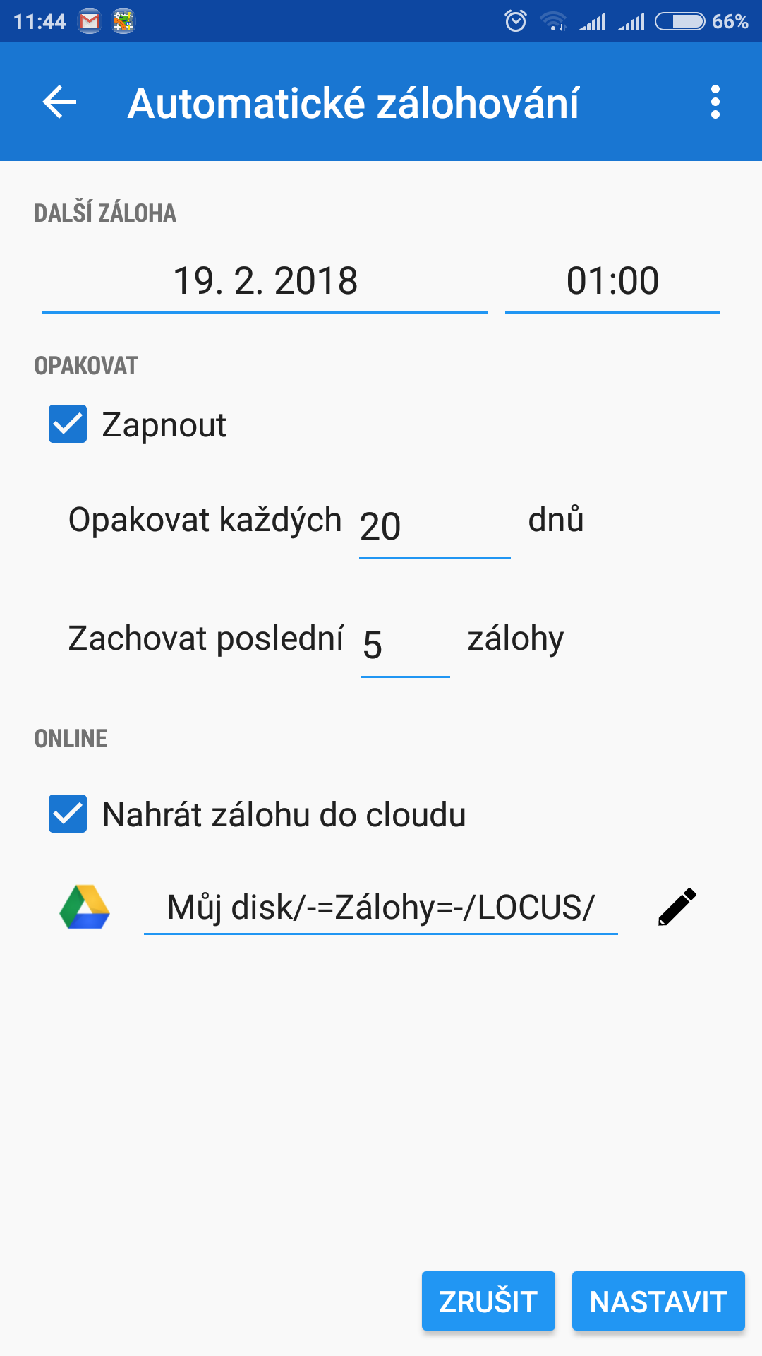 Zkusil jsem, ale Locus neudělá zálohu na Google drive. Zalohuje vždy každou nebo až když se shoduje pocet záloh podle nastavení. V tomto případě 5. Diky