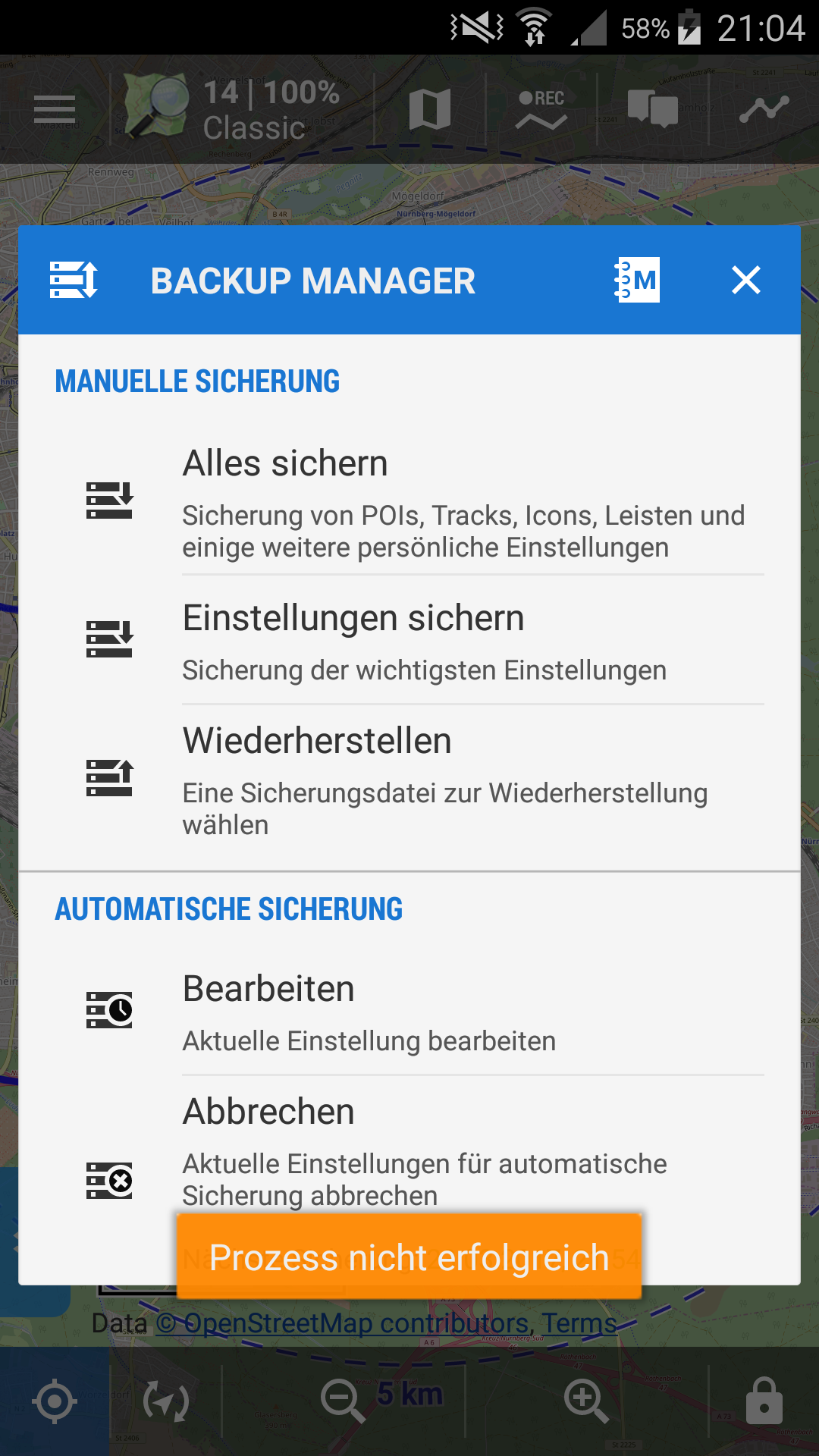 Since one week I try many manual backup tests. All have the same error message. See attachment from first post. I try also many automatic backups settings. Now I try a other backup directory and thats a message "Locus Map Pro - Automatsche Sicherung / Prozess nicht erfolgreich". If i touch this massage nothing happens. See another attachmend. Now i change backup directory back to "Standard".