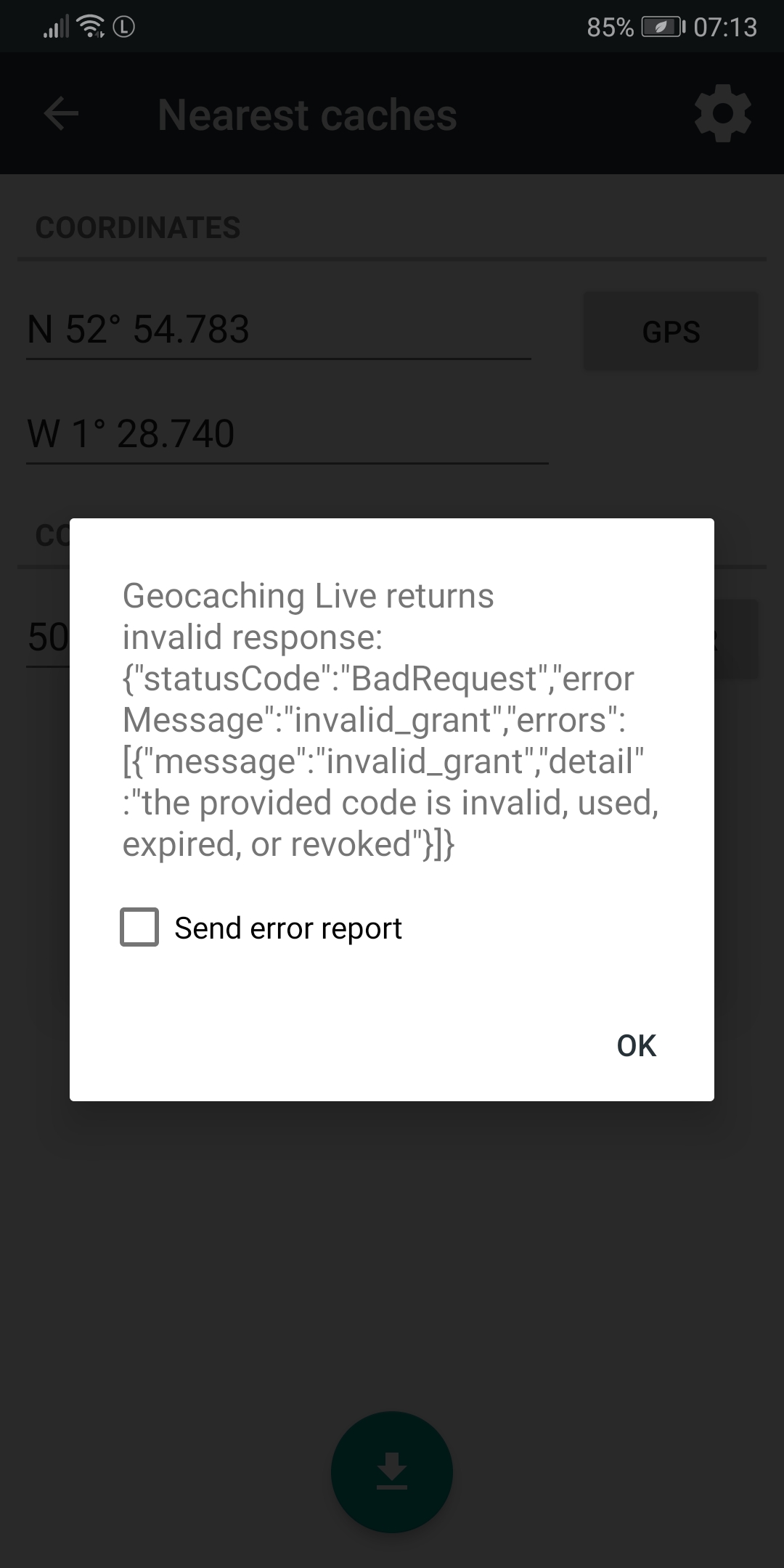 Here is a screen shot of the error message when I try to download nearest caches.