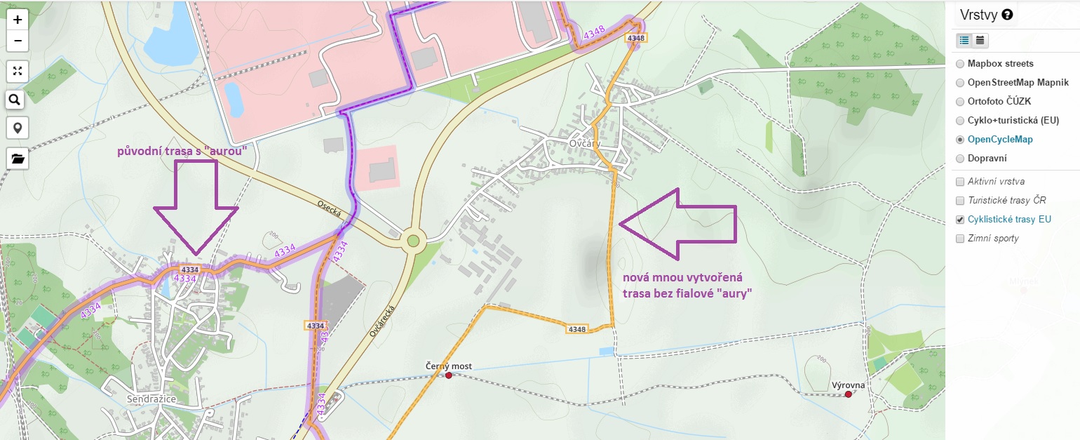 Děkuji za rychlou odpověď. Ze zvědavosti jsem zkusil části trasy doplnit a opravit. Na OSM.cz v podkladu OpenCycleMap je trasa mnou vytvořená vidět, ale "neobklopuje" ji fialová barva, která na ostatních trasách je... Nikde jsem se nedozvěděl čím to je. Vlastnosti trasy jsem okopíroval od současných cyklotras a vše sedí (tedy kromě čísla trasy) a fialová barva, znázorňující obecně cyklotrasy chybí... Nevíte čím by toto mohlo být způsobeno?