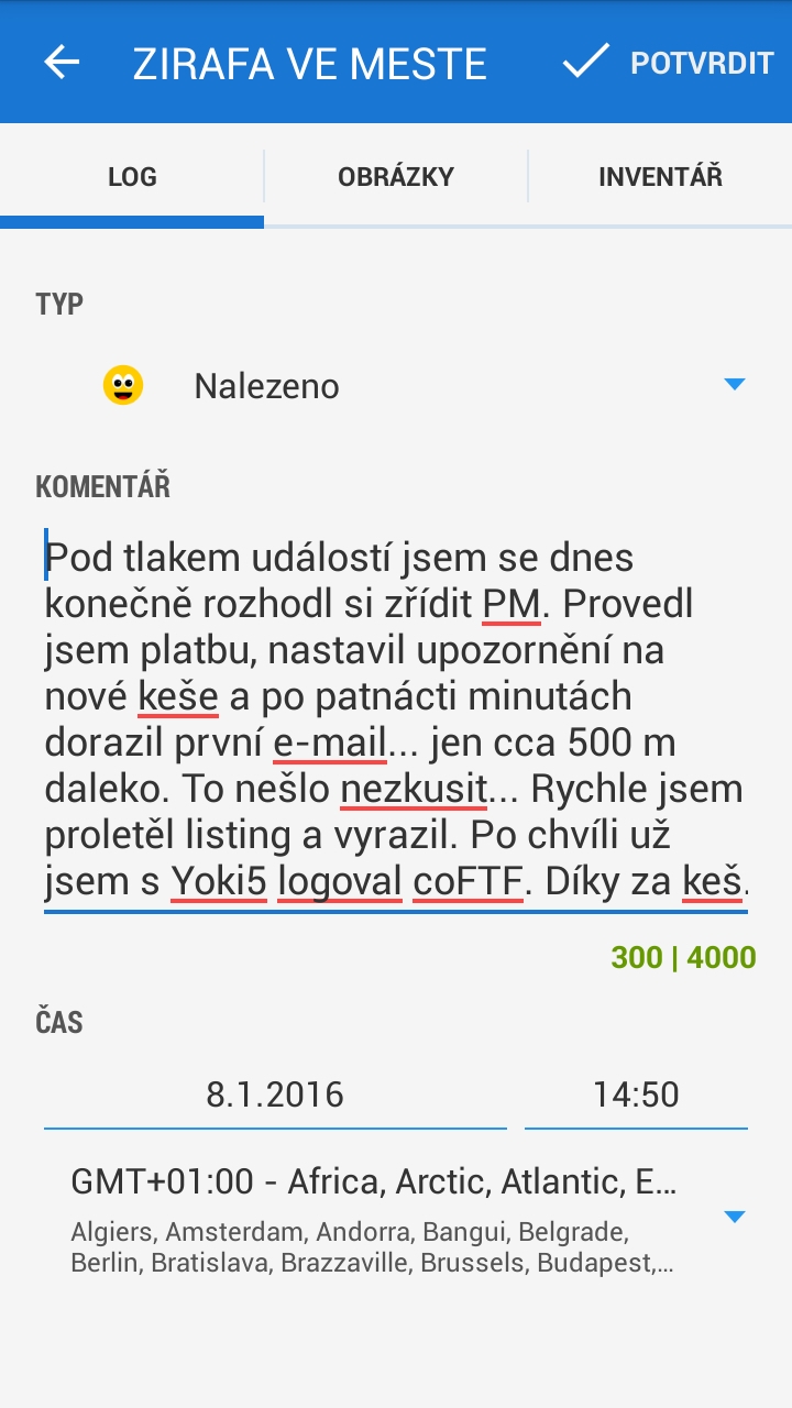 ještě doplňuji info - prvotní můj krátký záznam logu vznikl v Locusu, zbytek jsem doplňoval a odesílal přes FieldNotes Add-on. Přidávám ještě screenshoty, jestli není někde problém s přepočtem UTC na lokální čas. Všiml jsem si, že i v Locusu je čas zobrazován v jednom případě (UTC+0), podruhé v lokálním čase (viz "GC6911R_screenshot_3.jpg" a "GC6911R_screenshot_4.jpg").