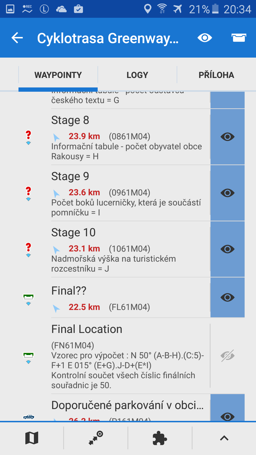 Narazil jsem na jeden malý nevýznamný bug. Když v přiloženém obrázku kliknu na "oko" nahoře, tak to označí všechny body kromě předposledního (který má nulové souřadnice) a vypíše to hlášku "Bod Final Location má neplatné souřadnice". Potud v pořádku. Když ale ručně kliknu na oko přímo vedle tohoto bodu, tak už se hláška nevypíše a bod se označí. Znovu odoznačit už ale kliknutím tento bod nejde.
