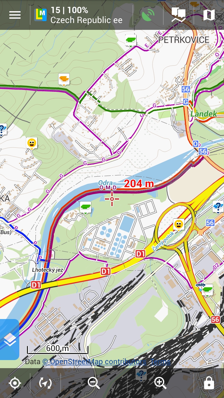 Dobrý den, narazil jsem na problém vykreslování OSM mapy v programu Locus. Samozřejmě netuším, jestli je chyba v mapovém podkladu OSM nebo v renderovací funkci v Locusu. Můžete se na to zkusit příležitostně podívat? Chybně se zobrazuje řeka Odra v Ostravě, je podstatně širší, zasahuje do vedlejších cest a jeden okraj bývá nahrazen přímkou. Naštěstí to není nic fatálního, ostatní věci jsou na svých místech. :-) Mapu jsem stahoval z "http://osm.paws.cz/", soubor "czech_republic_ee.map" Je to např. kolem souřadnic 49.8602333N 18.2488258E, ale narazil jsem na to i kousek dál na jih. Přikládám screenshoty.