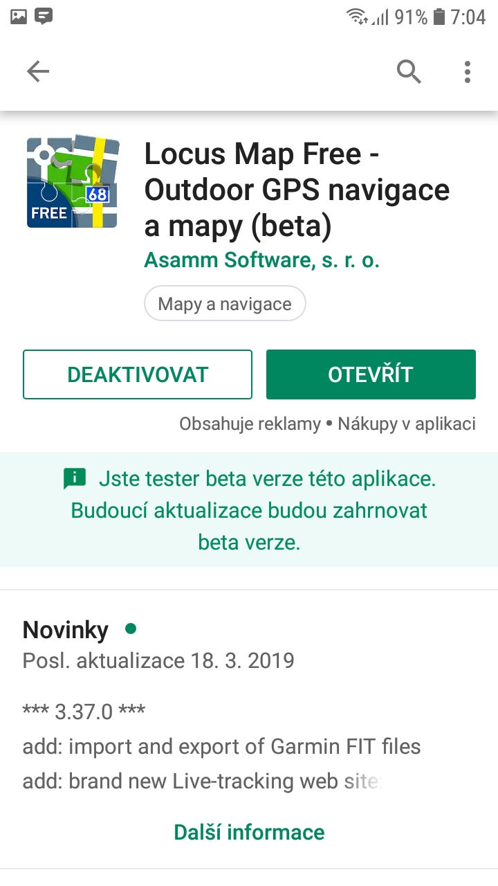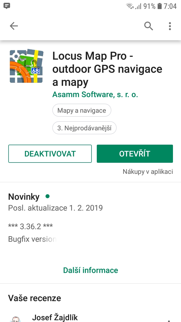 to "deaktivovat" vidíte nejspíše proto, že máte Locus povolen jako administrátora vašeho zařízení kvůli automatickému zapínání displeje. Když toto povolení odeberete, budete moct Locus odinstalovat. Pokud to tedy považujete za nutné. Co se týče staré verze na Google Play, taky jsem neměl automaticky LM Pro aktualizovaný - chvilku jsem s Google Play laboroval a verze 3.37. naskočila za chvilku sama. Nejspíš bude určitě fungovat, když vysypete dočasná data GPlay aplikace.