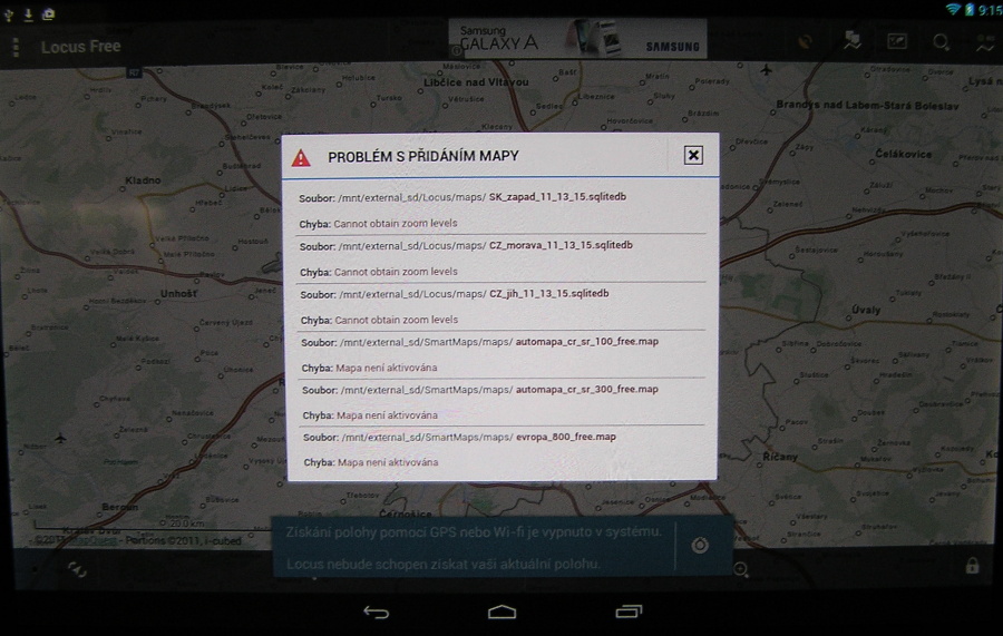 1. Vypíše Locus na tabletu nějaké chybové hlášení - např. při startu nebo když otevřte Menu - Mapy - Vektorové