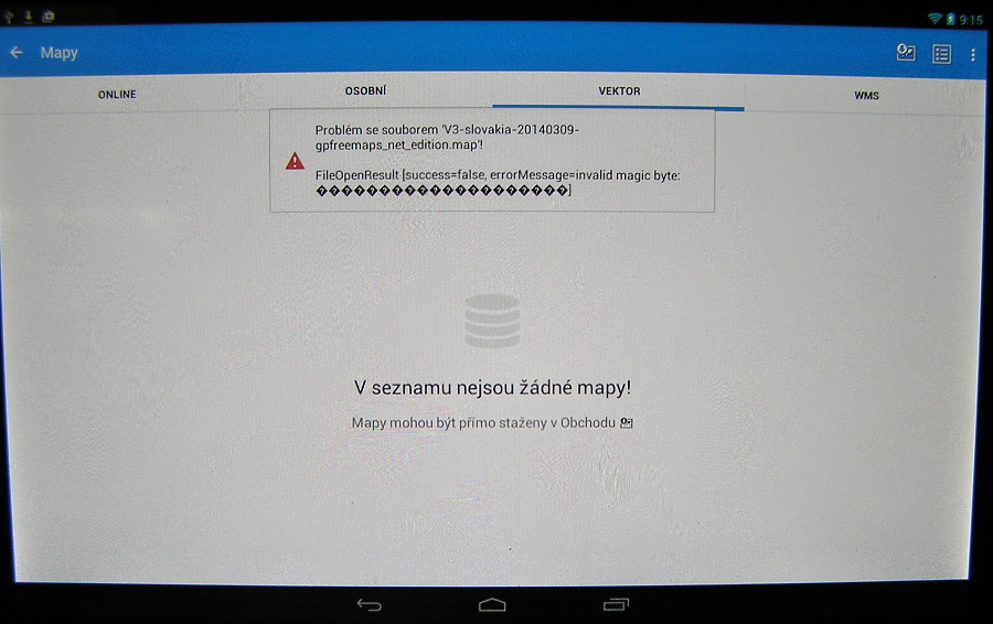 děkuji za podrobné info, ale nejsem si zcela jist, jestli jsem dobře pochopil vaše změny kolem map od SmartMaps. Nicméně zaměřme se v prvním kroku na hlavní problém tohoto topicku - vektorové mapy. Screenshot P3020003.JPG vypisuje chybovou hlášku "Invalid magic byte" To naznačuje, že se může jednat o nepodporovaný formát map a nebo je soubor poškozen. Můžete je prosím zkusit zkopírovat znova z PC do tabletu. Doporučuji zkusit stáhnout nejnovější vektorové mapy z Locus Store.