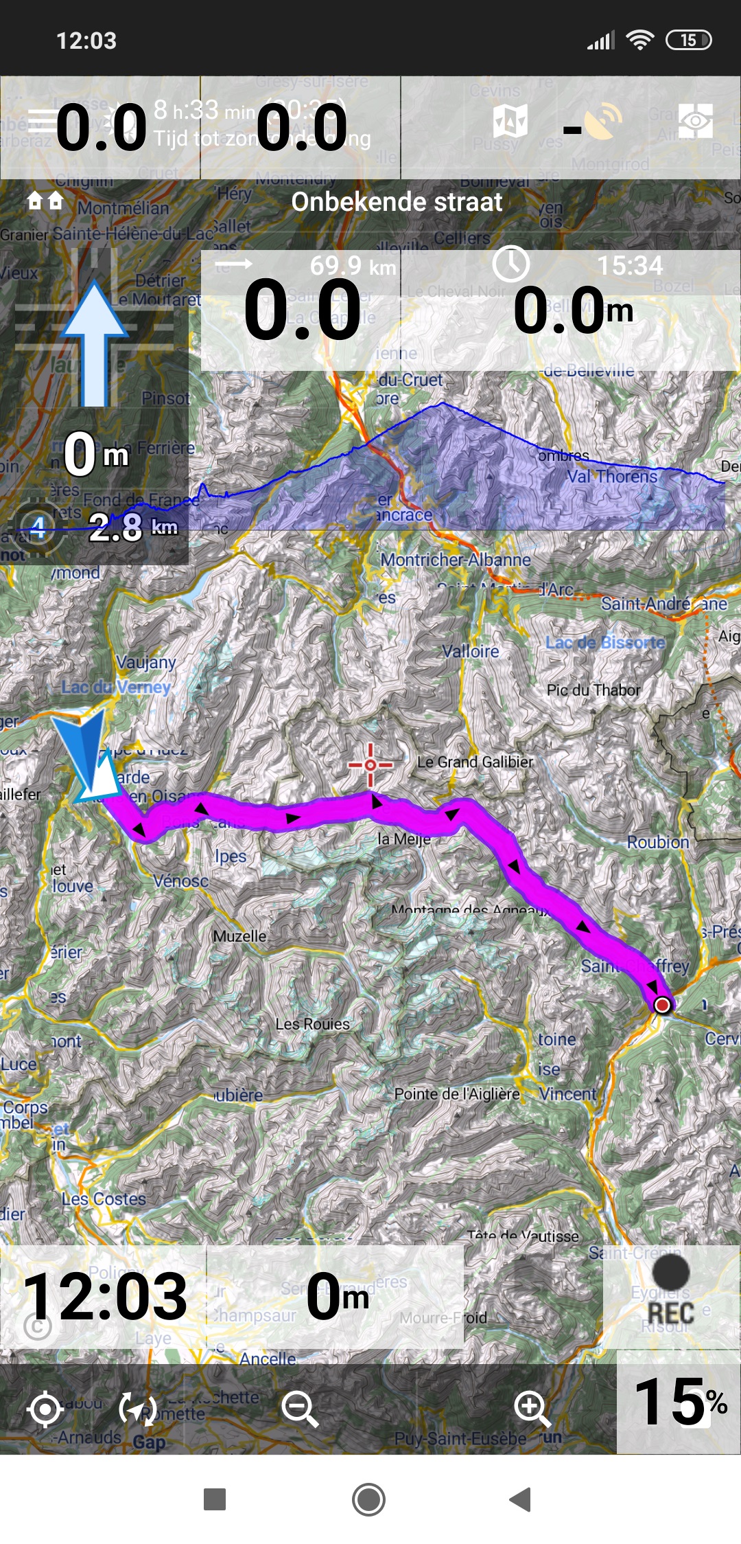 In the screenshot is a route of 70km in the French Alps. In the graph the whole route (elevation) is visible. In the first 40km the route climbs from 750 to 2050 metres.