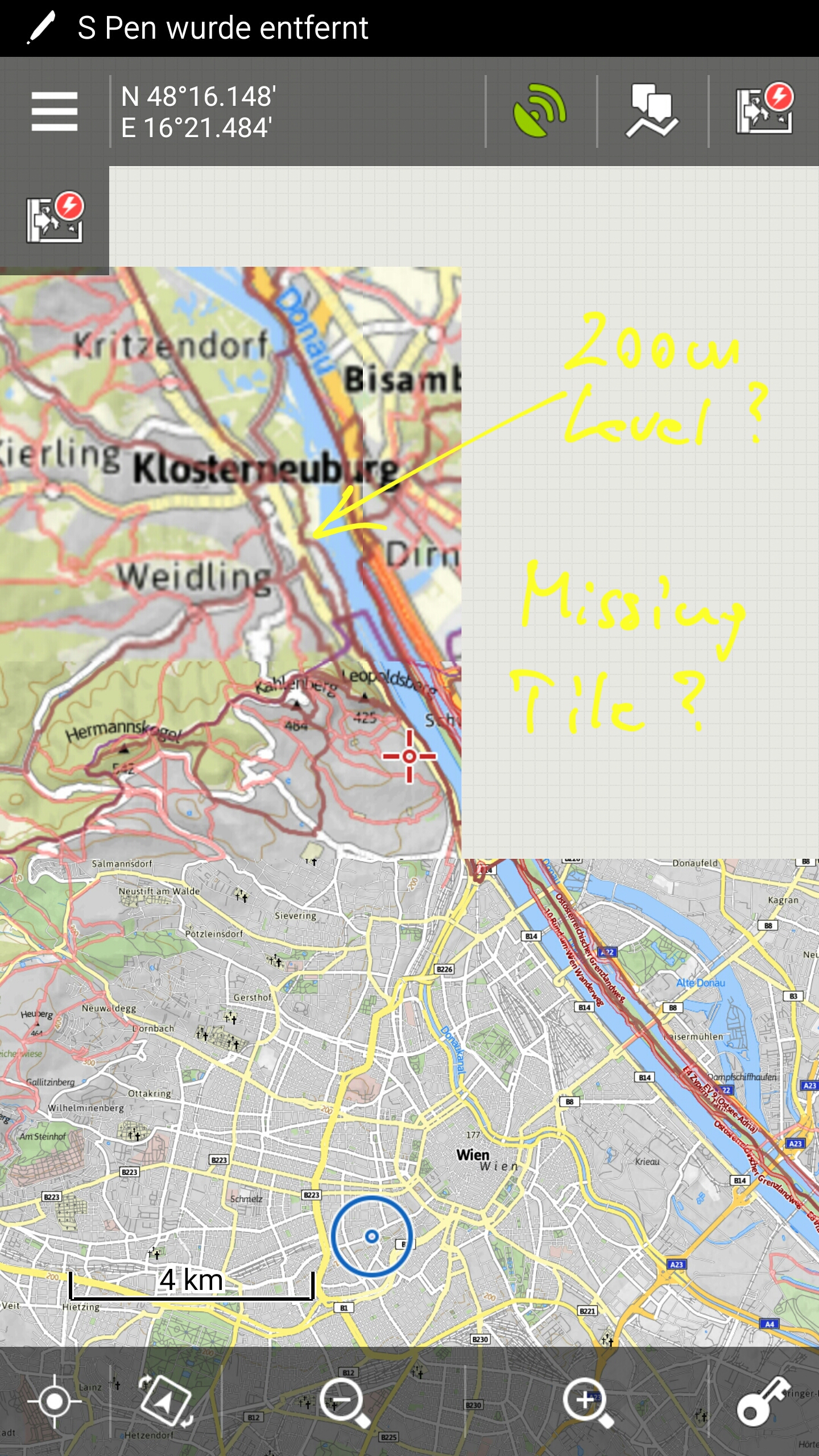 thanks for the immediate reply. But I don't agree with your answer, that the missing tile is out of the boarder of the downloaded area. I send you a few more screenshots. You can see, which areas I have downloaded (yellow highlighted). The eastern tile should cover whole Vienna and Klosterneuburg as well. But it only does on a higher zoom-level. As soon as you zoom-in, tiles disappear oder remain at the same zoom-level. Within the boarders of the more western area you can find more examples of tiles with a different zoom-level and tiles with no geo-information at all. I have bought both maps for 300 LoCoins each and I expect them to work properly.