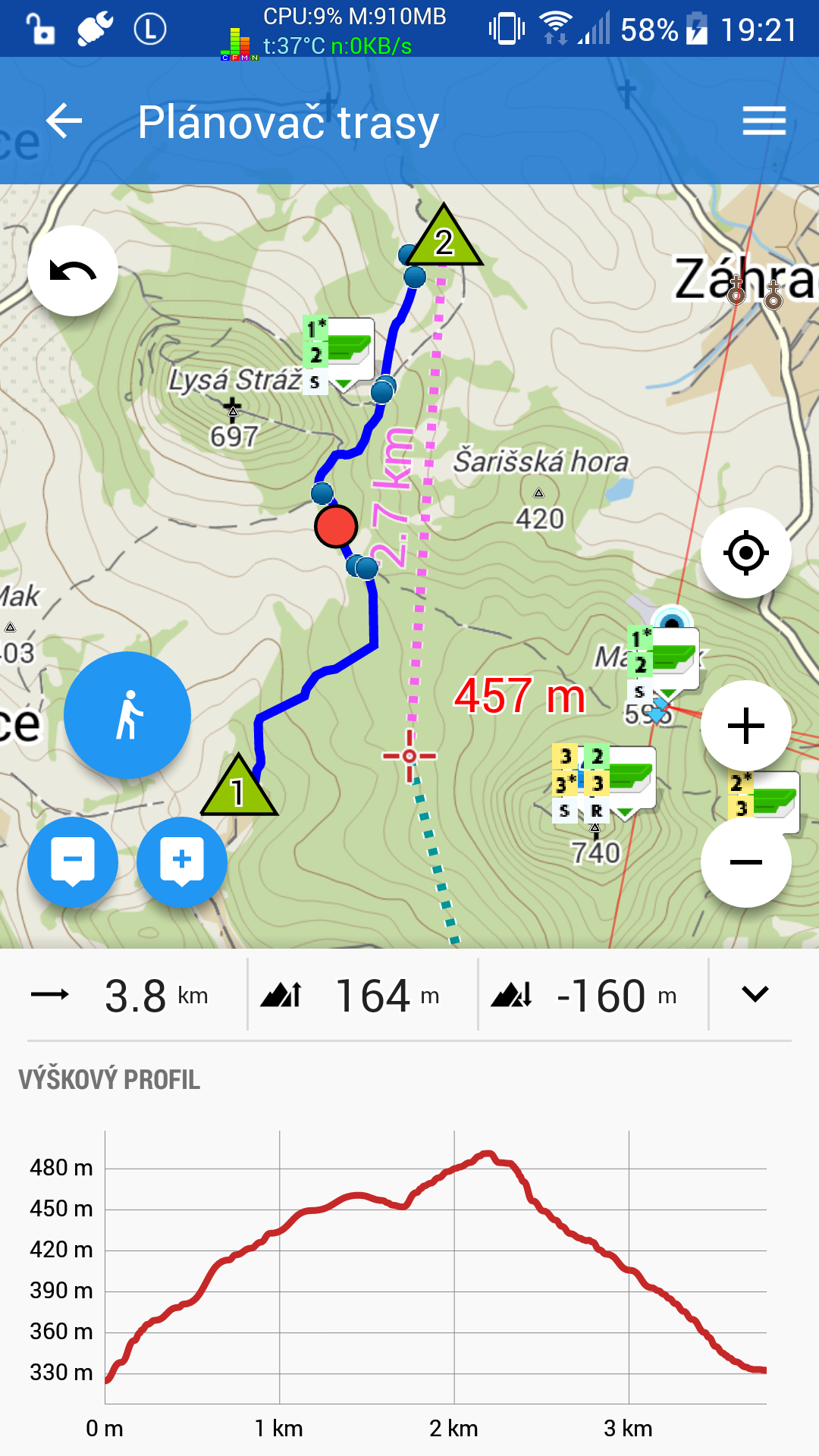 - for more complicated measurement or measurement from another place then your current location should really be used "Route planner" as Condor correctly mentioned. There is an option (left big blue button) to set manual draw, so you may get elevation chart directly between two points. Also try to move with points when the chart is visible, nice heh? :).