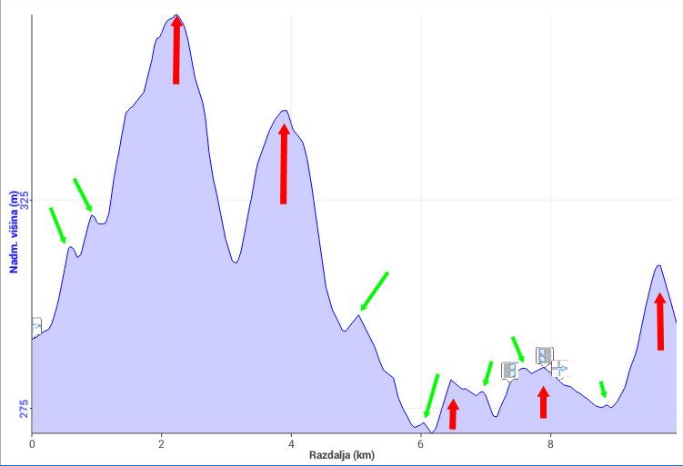 For me can be very useful if navigation can show you how much distance you have to next top of hill (red arrows) and in some way ignore little tops on the way (green arrows) - see picture example...