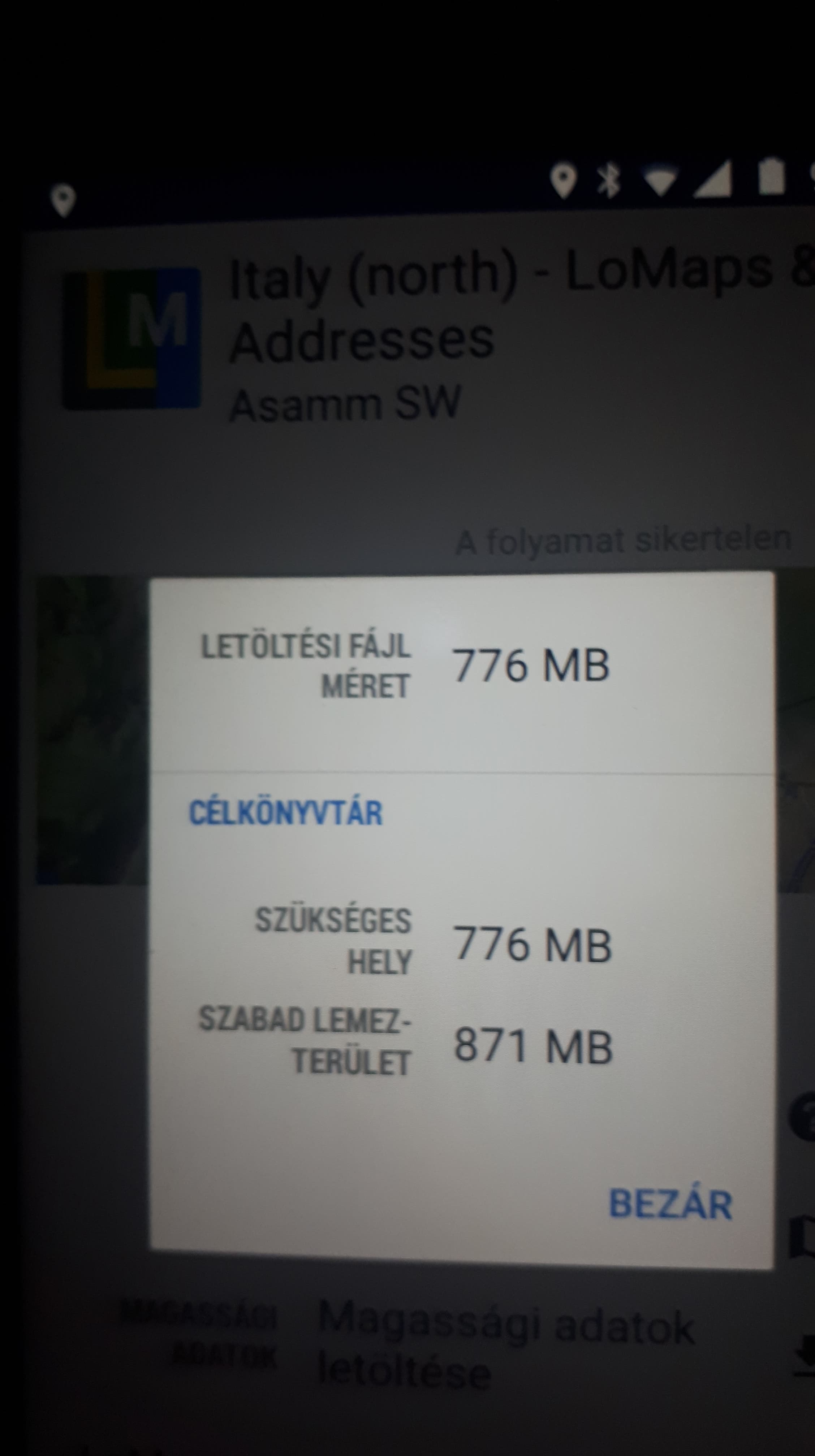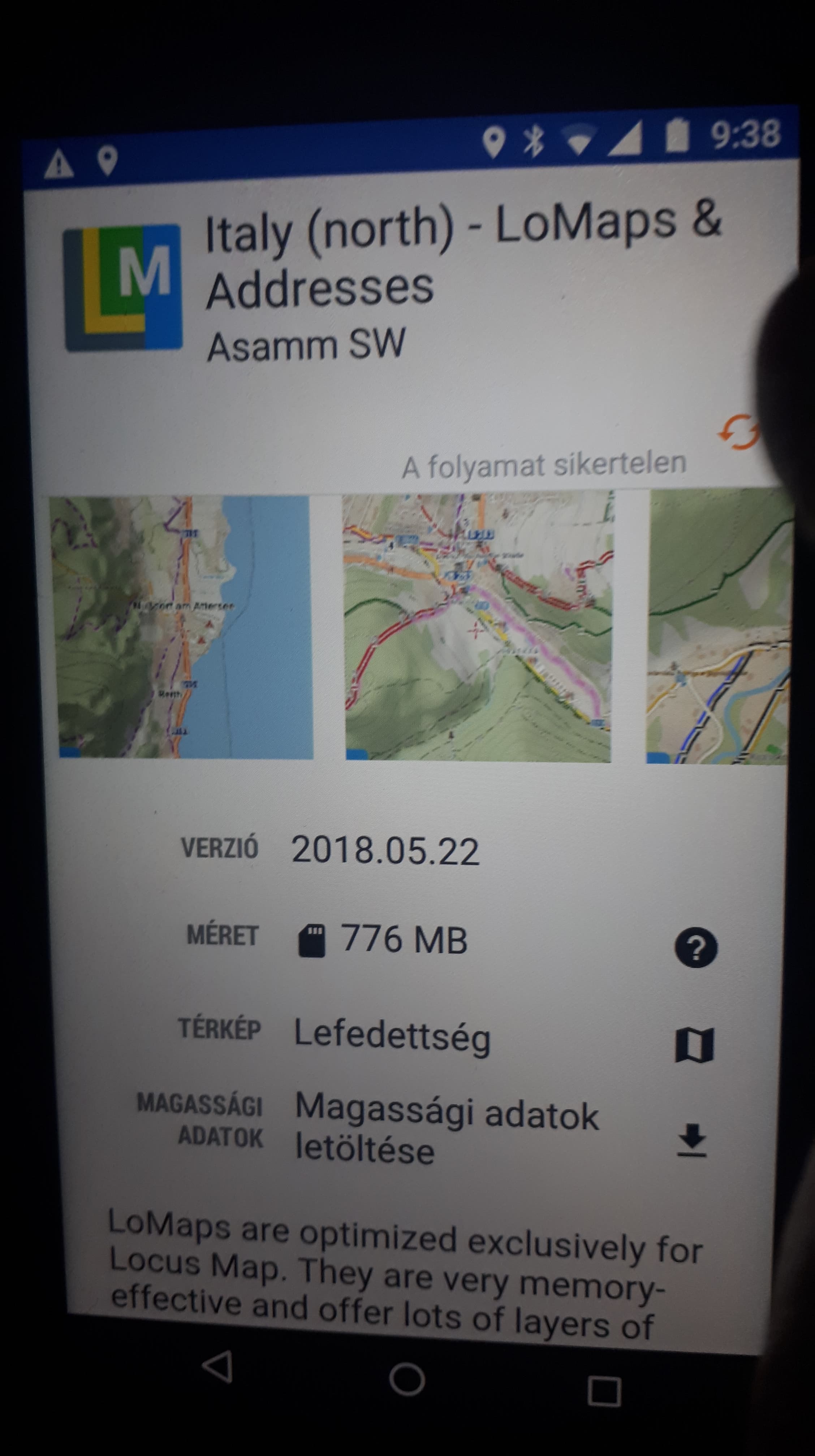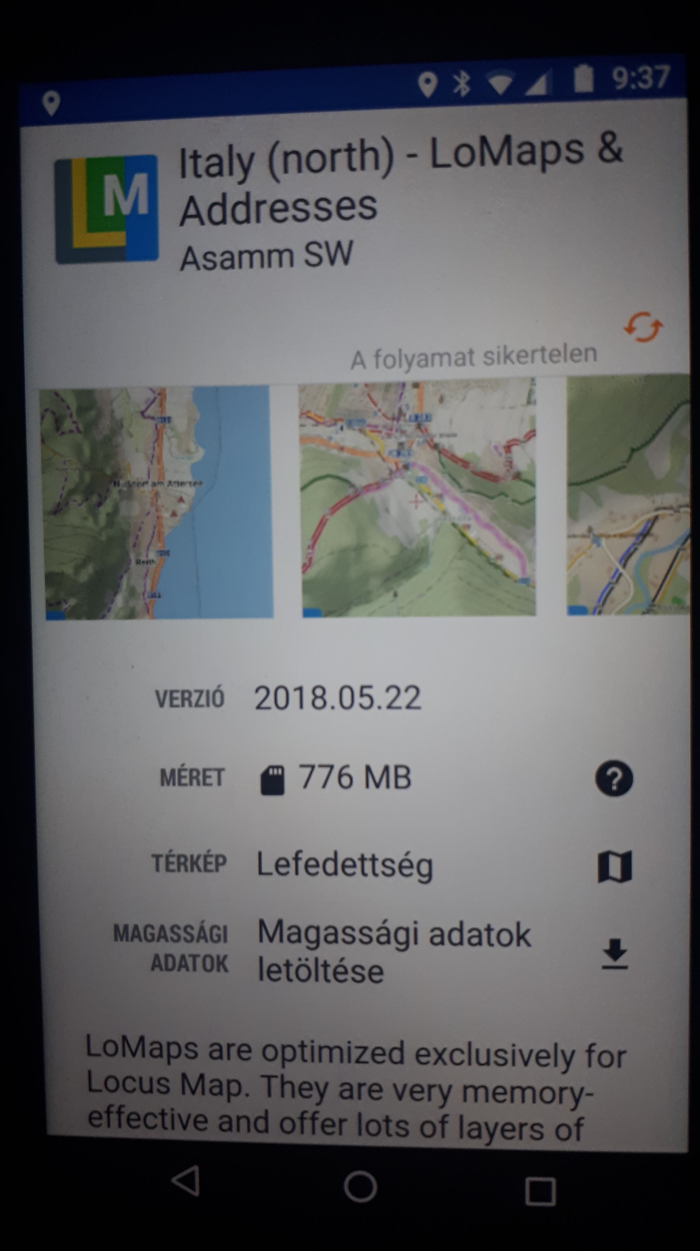 In case of north Italy, Locus needs almost 800MB for download of map, and then around 1000MB to extract the downloaded zip. So please check if you have close to 2GB of free space in your device and give it a try again.