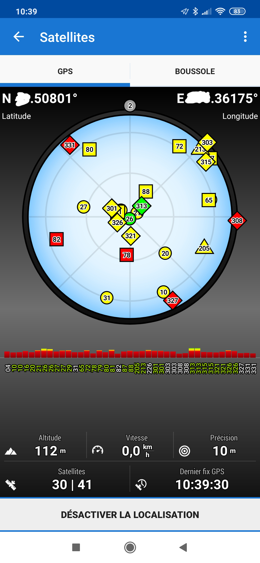 J'ai oublié de dire que nous pouvons voir les doubles fréquences sur la page satellite Locus. En fait, il indique les numéros de satellites en double lorsqu'il y a deux fréquences. 331-331, 303-303.....Ecran de GPSTest.