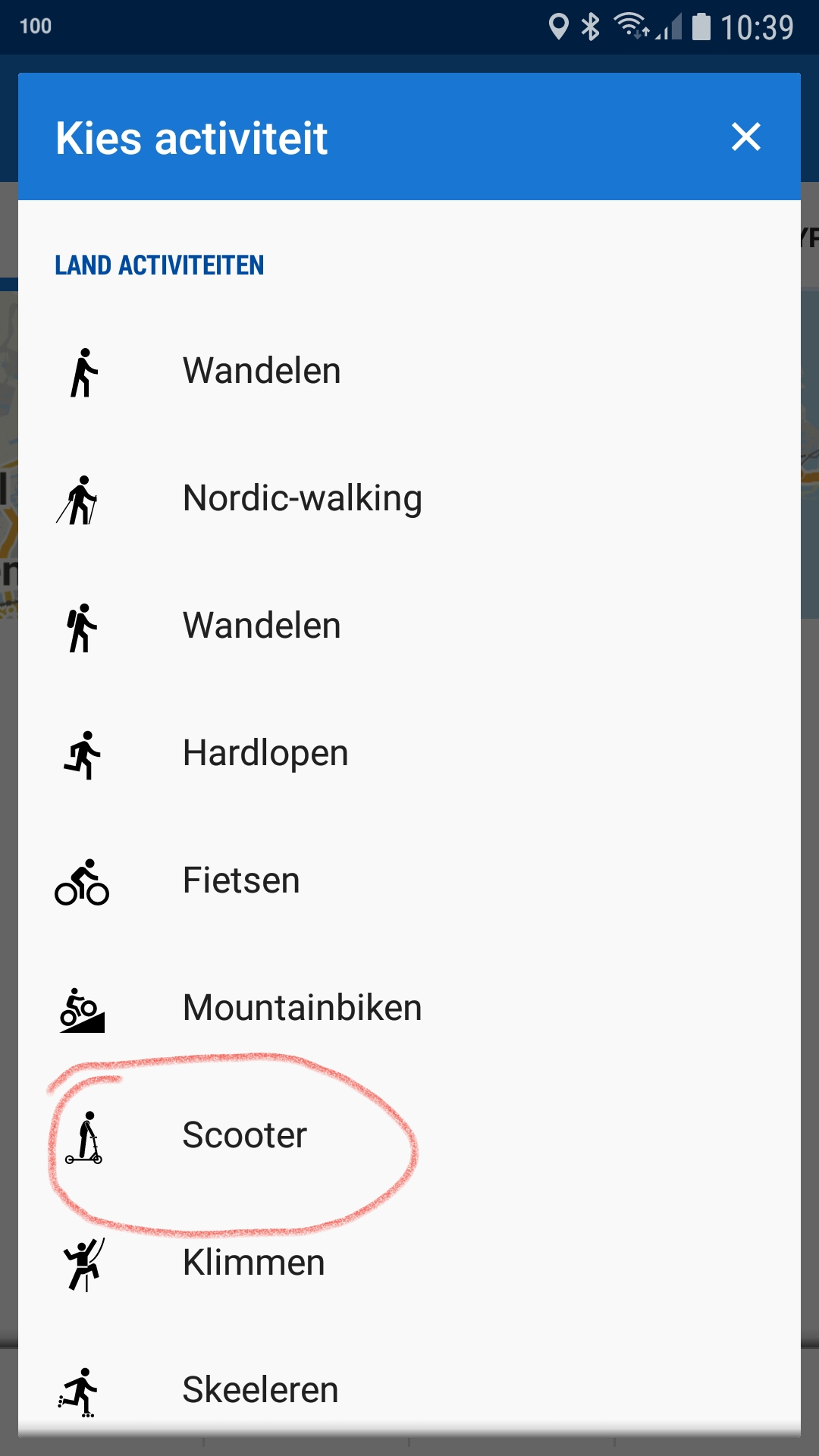 On the create track page you can select the kind of activity, there is an option to choose a "scooter" but the icon is from a "step" or "autoped" as we call this in the Netherlands.