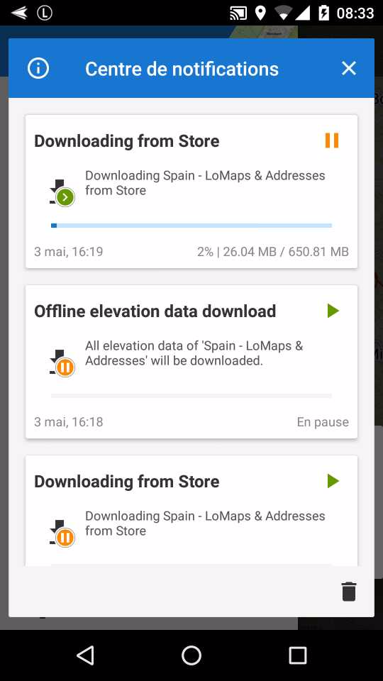 many thanks for your fast answerWhen the download is finished for spain for example, I get "traitement réussi" (download successful) in place of amount downloaded, so everything looks normal, and I can display the map zoom, etc