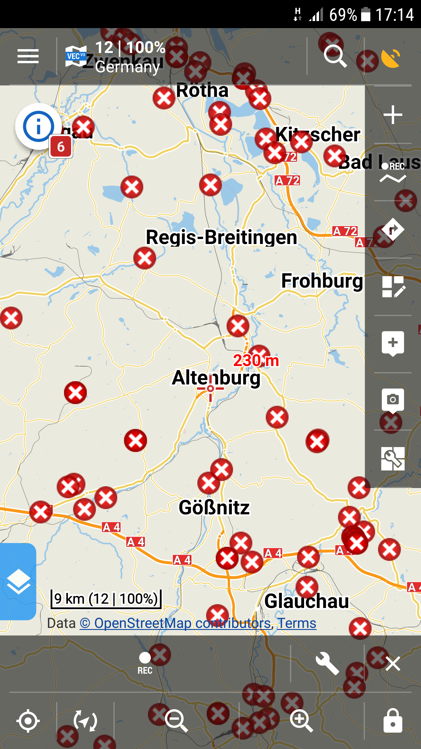 Bei den neu geladenen Offline-Karten (openandromaps) werden weiße Kreuze in einem roten Punkt auf der Karte angezeigt. Die Punkte bleiben immer an der gleichen Stelle auf der Karte, unabhängig vom Zoom-Faktor. Ich vermute, dass an dieser Stelle ein Symbol nicht richtig angezeigt wird.