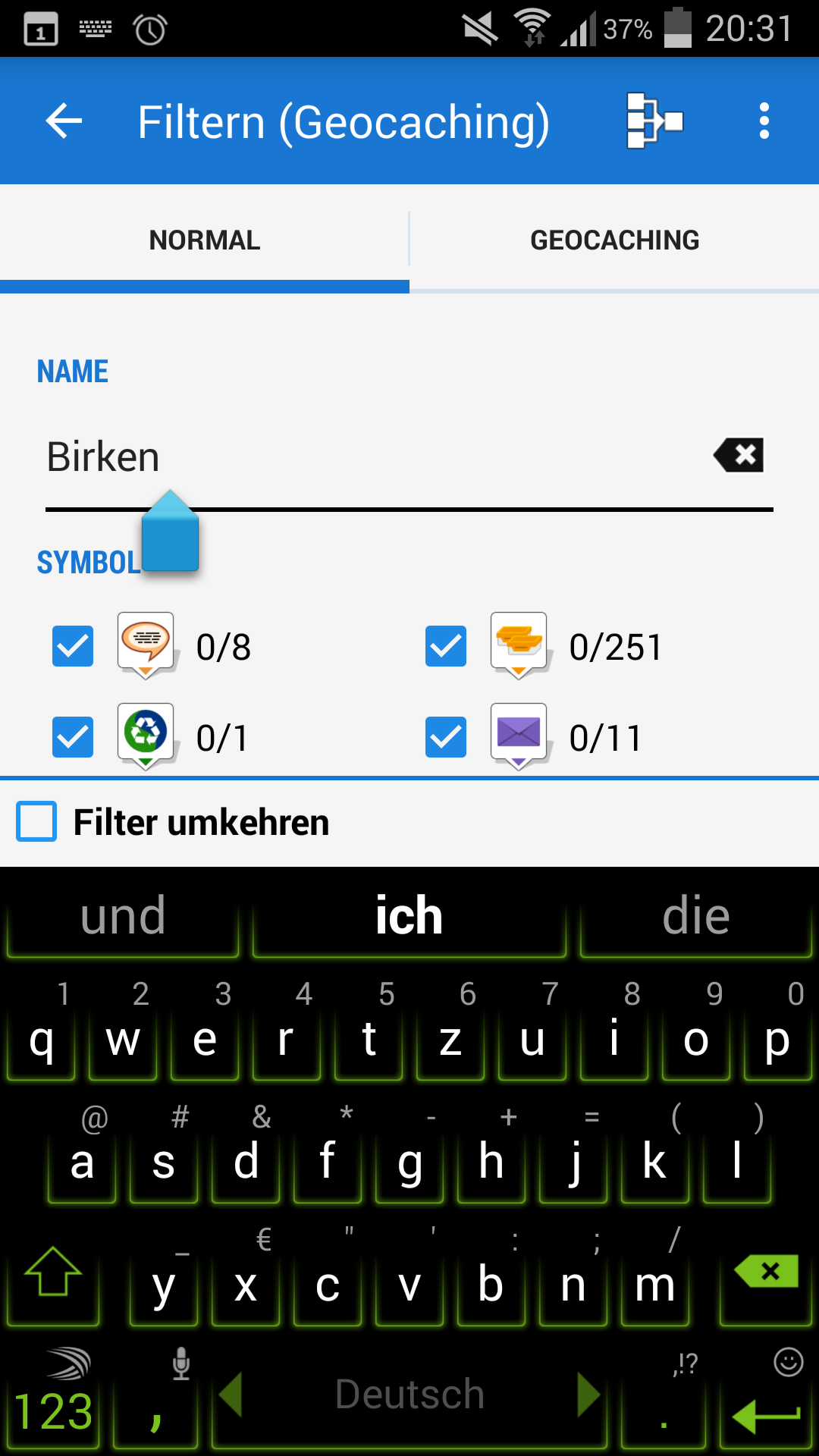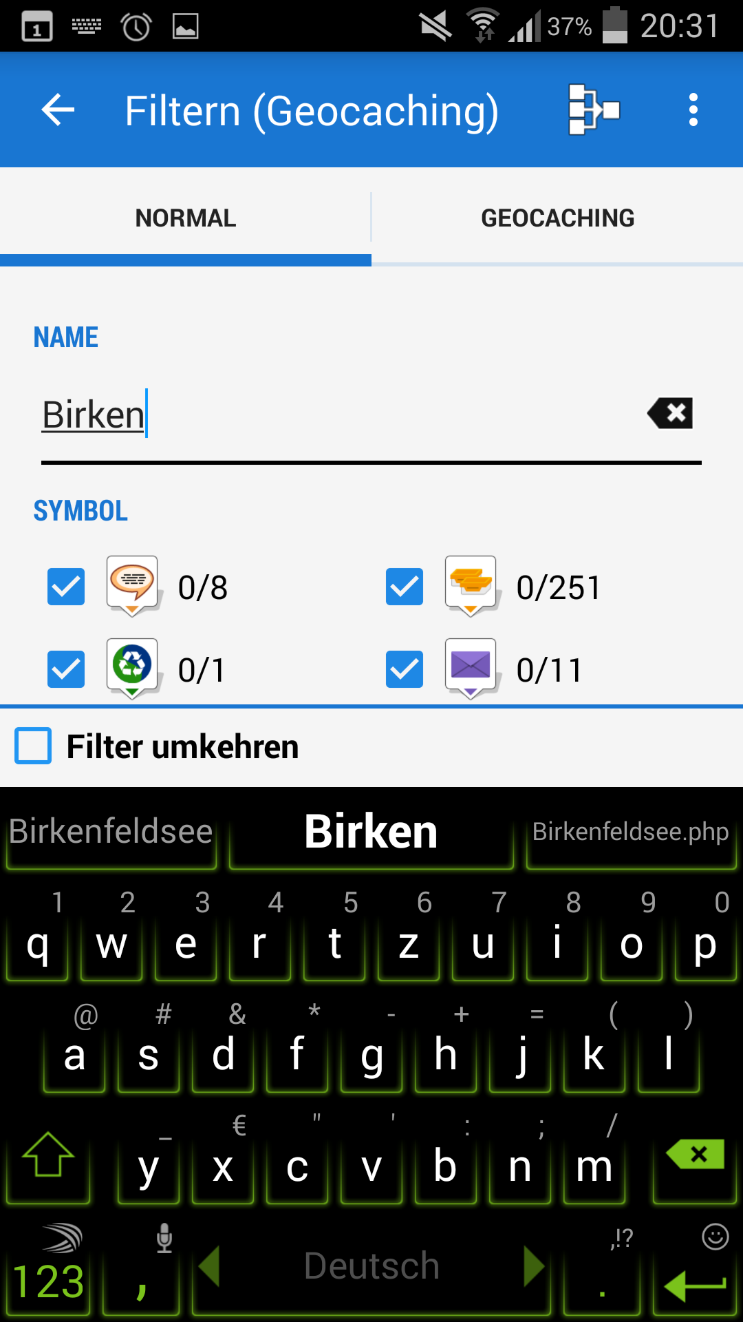 I tried to filter for some geocaches by name, and i saw that it makes a difference if there is a space at the end of the search words.