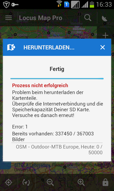 Well... both are ok. My internet is working correctly and any other applications have no problems using it. Also my SD card has more than enough free capacity... but... why the hell is LocusMap not able to point out a little closer, what the problem is? It must be possible for this program to check, if the internet connection is working or not, also it must be possible to check SD card for remaining space and tell the user, how much space is needed at all.