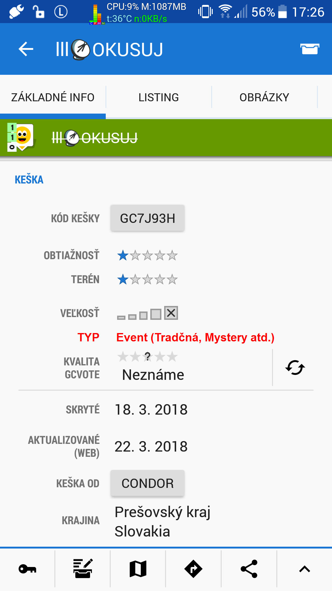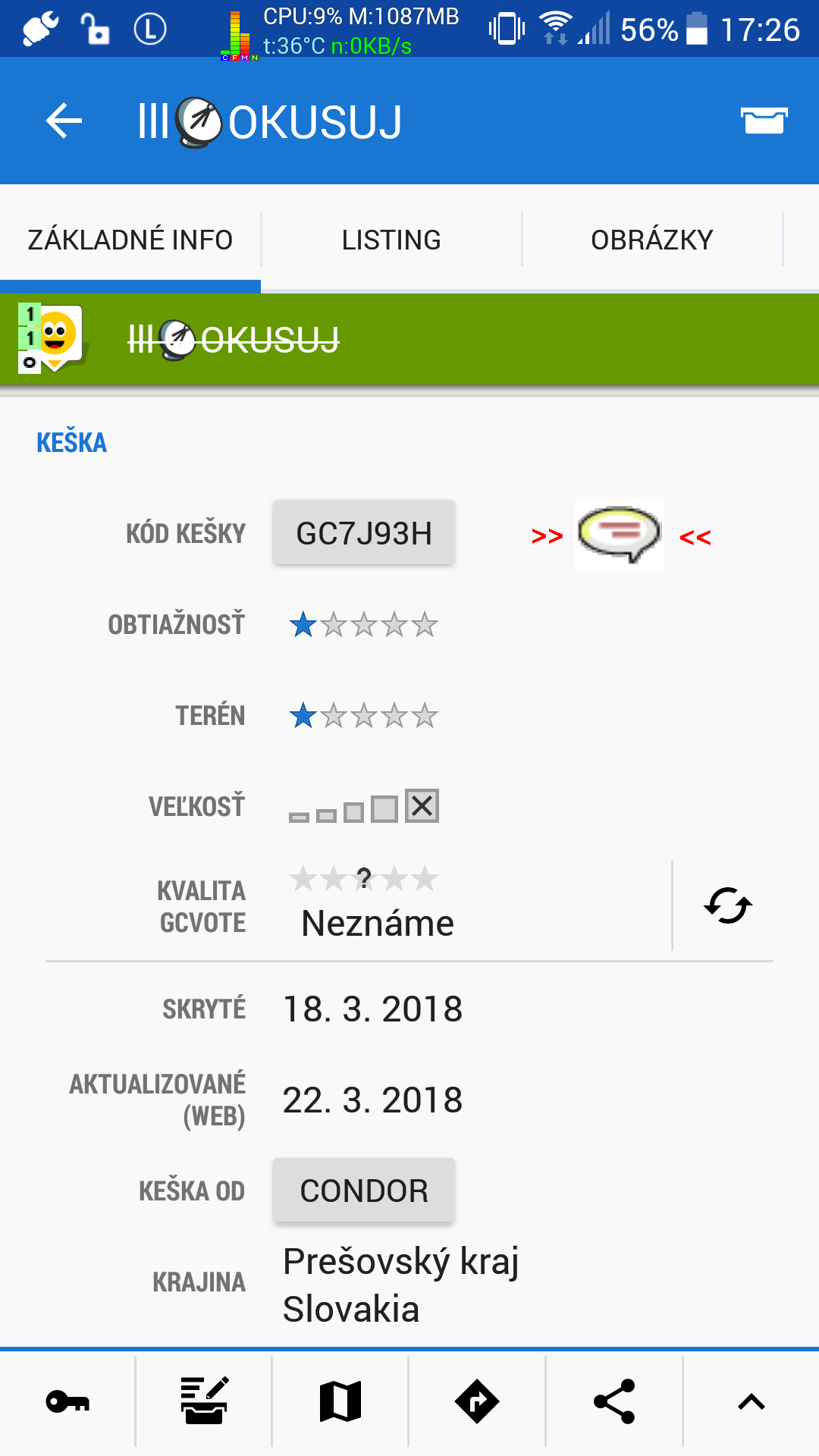 Screen1: If there are dozens of other found smileys nearby, it's an annoying and timeconsuming task (especially on slower, older phones) to sequentially click onto several found caches icons, then click onto the pop-up window to open its description site, and finally scroll down to see it's cache-type icon.