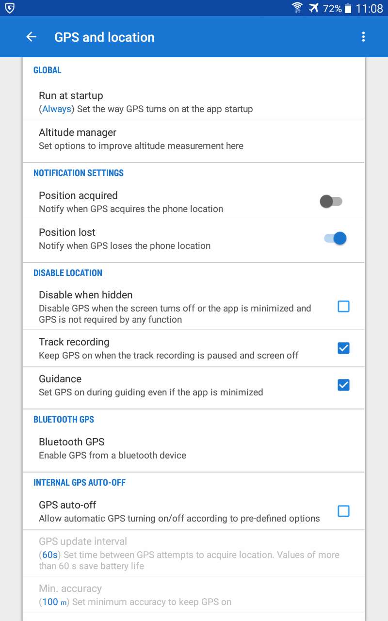 Instead "Run at startup", "Disable when hidden", "Track recording", "Guidance", 5 settings "Internal GPS Auto-Off"