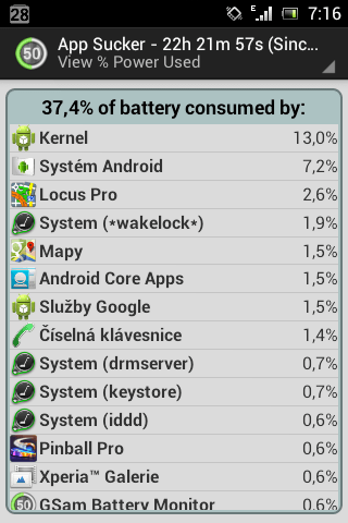 Na tom obrázku je vidět, kdy a na jak dlouho jsem spustil Locus (je tam spuštěná GPS). Nic jiného jsem nedělal, tak to bude pravděpodobně tím Locusem. Teprve se učím s Androidem a nevím, jestli to je, nebo není normální u aplikací tohoto typu.