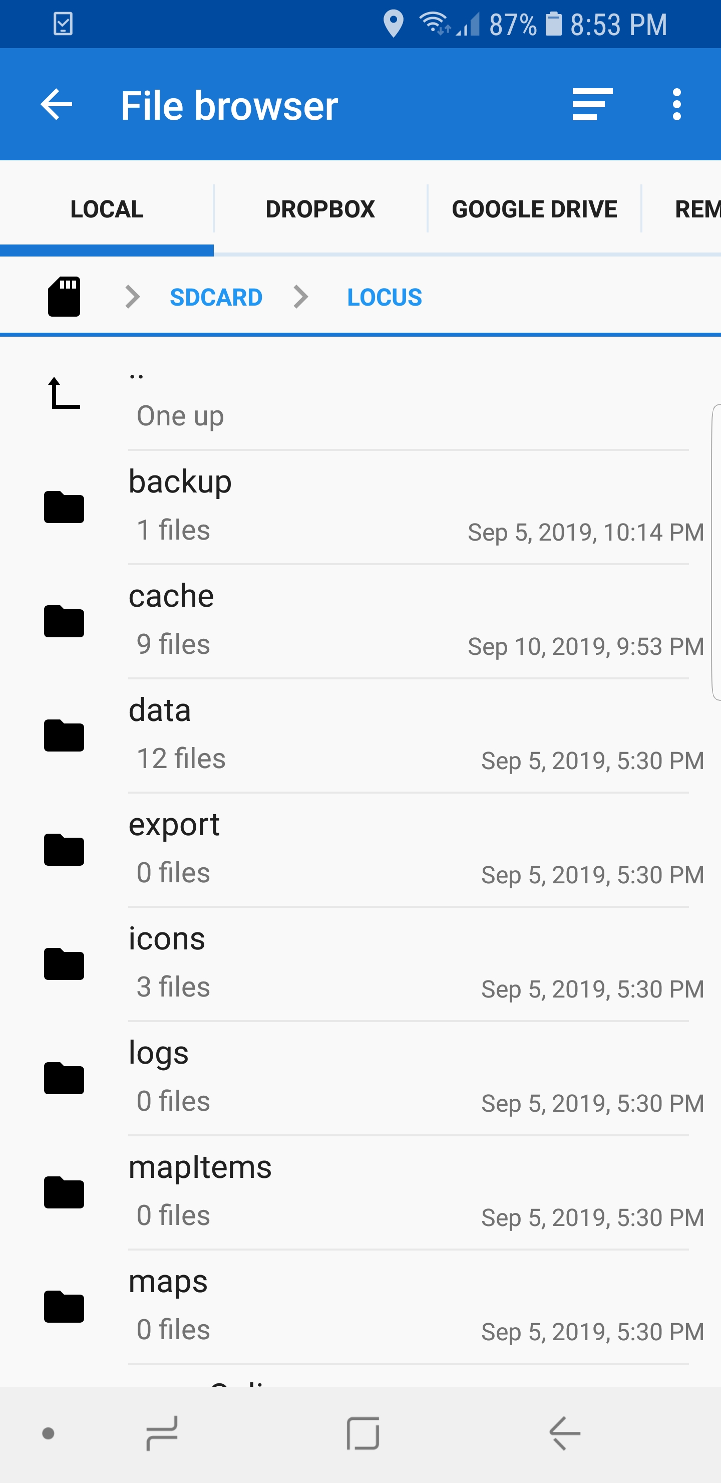 In the Locus file browser under Import/Local the furthest I can go back is to an icon that looks like a SD Card but doesn't appear to be the SD card. Some of the folders under here are acct, bt_firmware, cache, carrier. This looks like nothing I see as either main storage OR SD Card when I use Fx File Explorer. I have no idea what or where this default directory is or how to get to either the main storage or SD card from here.