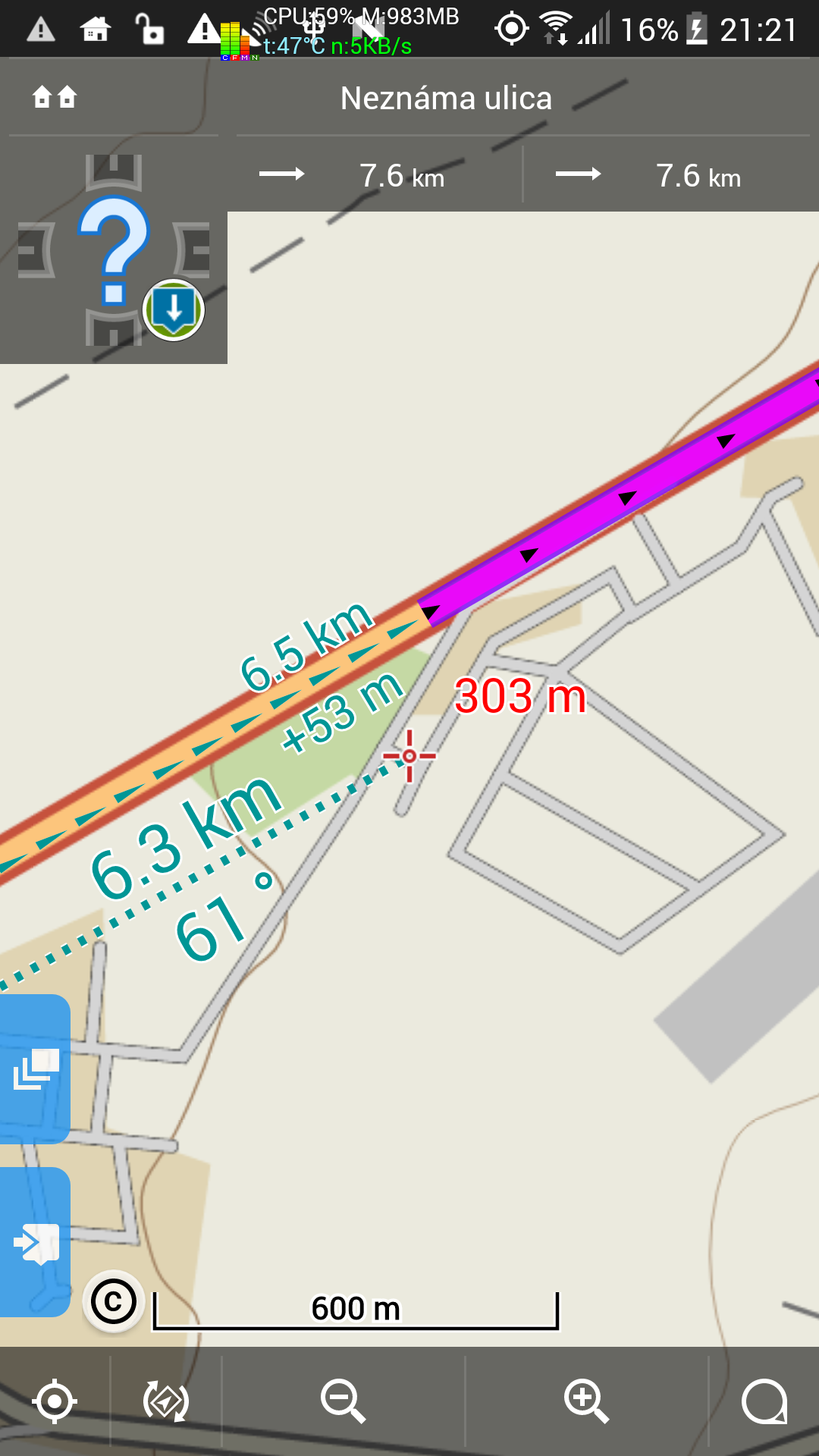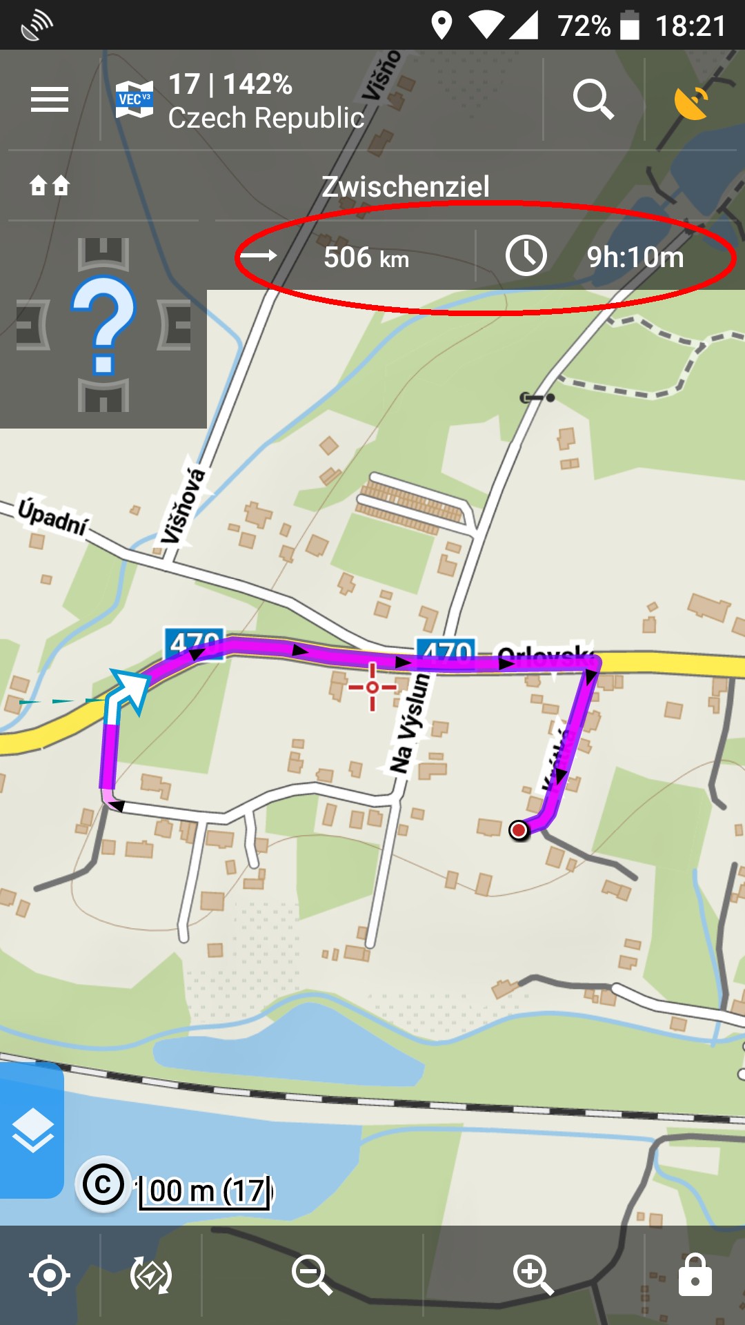 For a first moment everything seems fine. The route is shown correctly and the distance calculation shows the correct value. But when the first position fix occurs, the display of the distance is immediately switched to the distance from GPS to destination. The route on map is further shown correctly but above the distance and the time to destination is wrong.