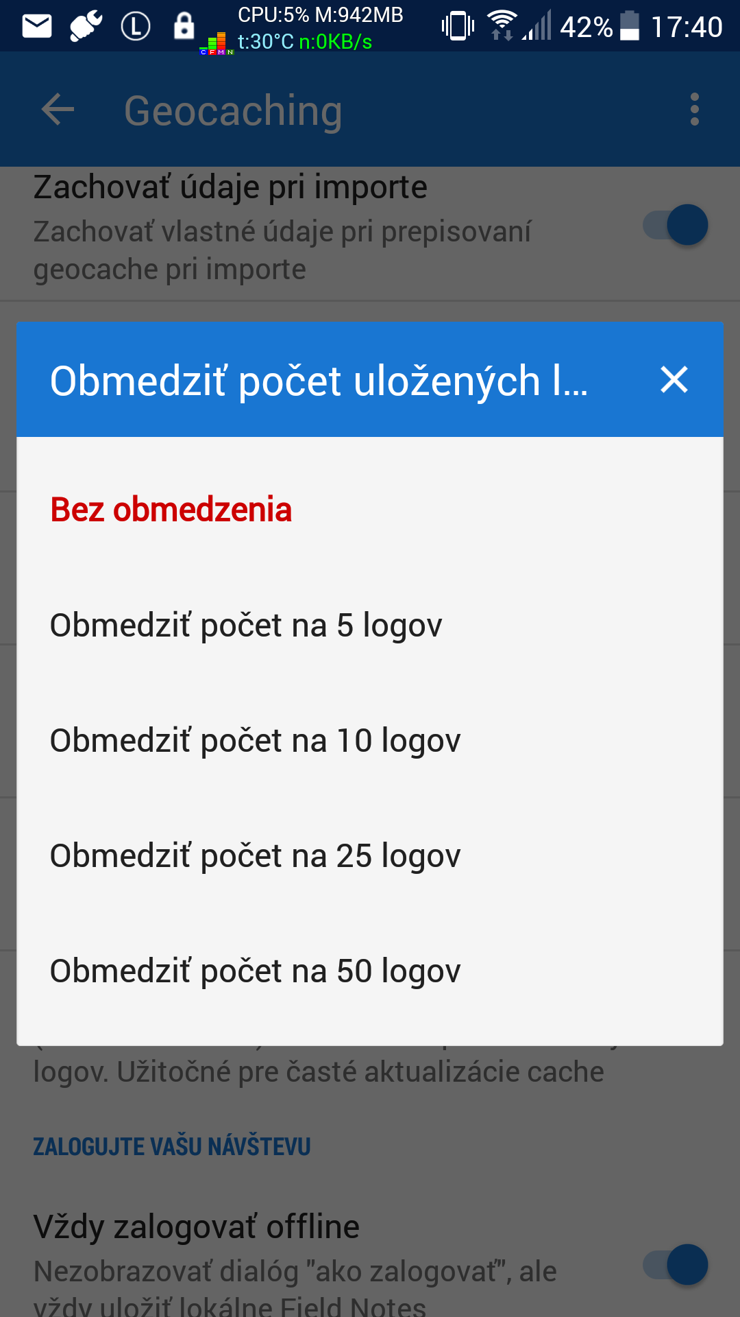 In the Geocaching4Locus preferences (Downloading), I have setup to download 15 logs (Count of logs). When I update the cache, it is correctly updated and 15 logs are correctly downloaded. Then, there is a second button what can be used to update just cache logs - "Download logs". It would be great if this option would load a different number of logs. Generally, I am downloading hundreds of caches and almost for all of them, 15 logs (or even less number) is more than enough, therefore, the option for "Count of logs" is good. However, for some cache, I have a need to see more logs and for that I always need to load that cache in the browser - to be able to see more logs (or all of them). It would be great to have this option directly in G4L. When "Update cache" is pressed, only the "basic" number of logs would be downloaded, but when "Download logs" is pressed, it would be possible to download much more logs (maybe a new setting would be nice to let us setup the number of logs for this). Thanks in advance for considering this idea.