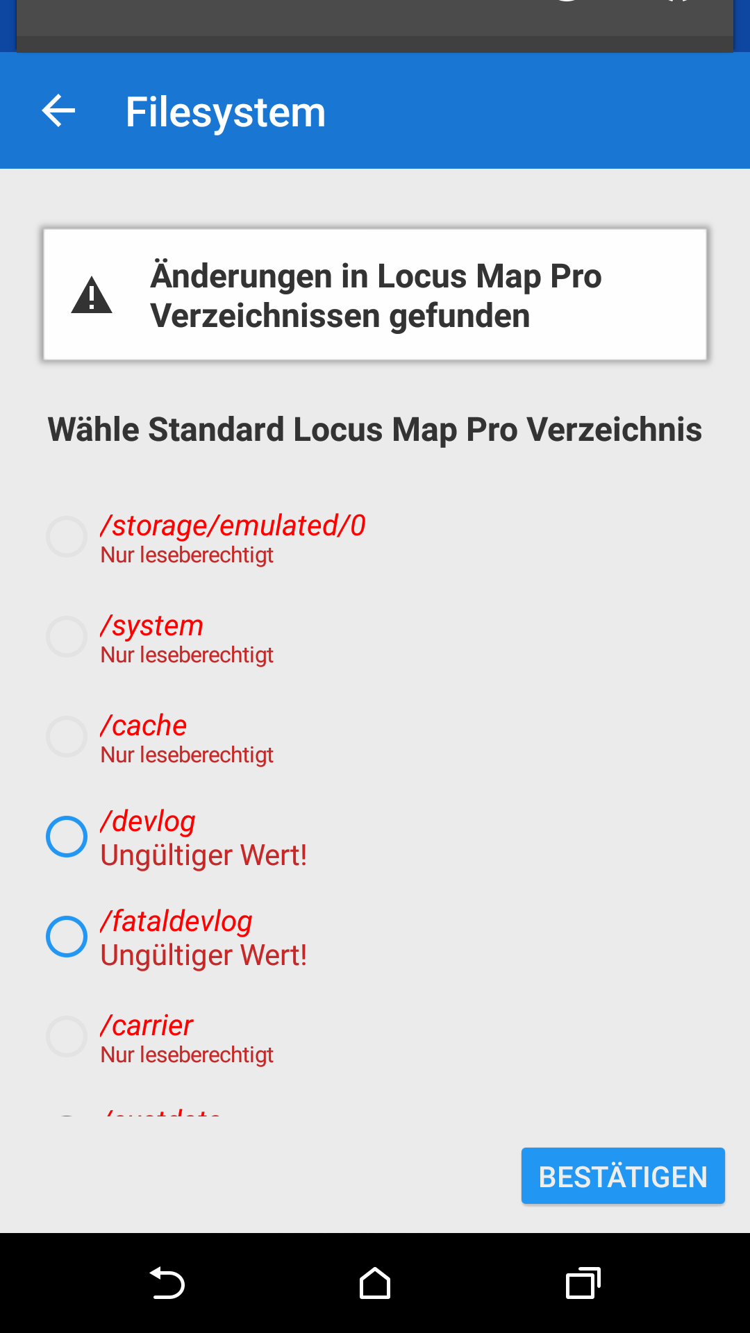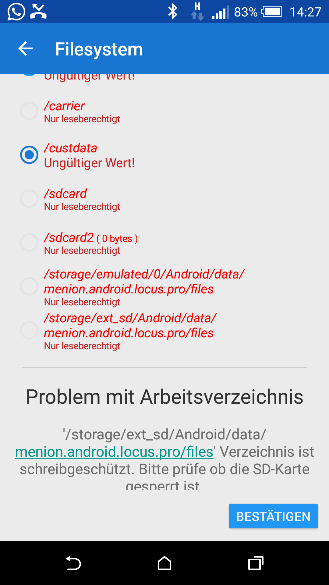 It happened again, possible after a phone restart, but I cannot tell for sure. Locus then comes with an error messsage that the ext_sd is not accessible, but all the other suggestions don't work either (see attched screenshots). So I am stuck, even after a restart of the phone and after deleting the data folder.